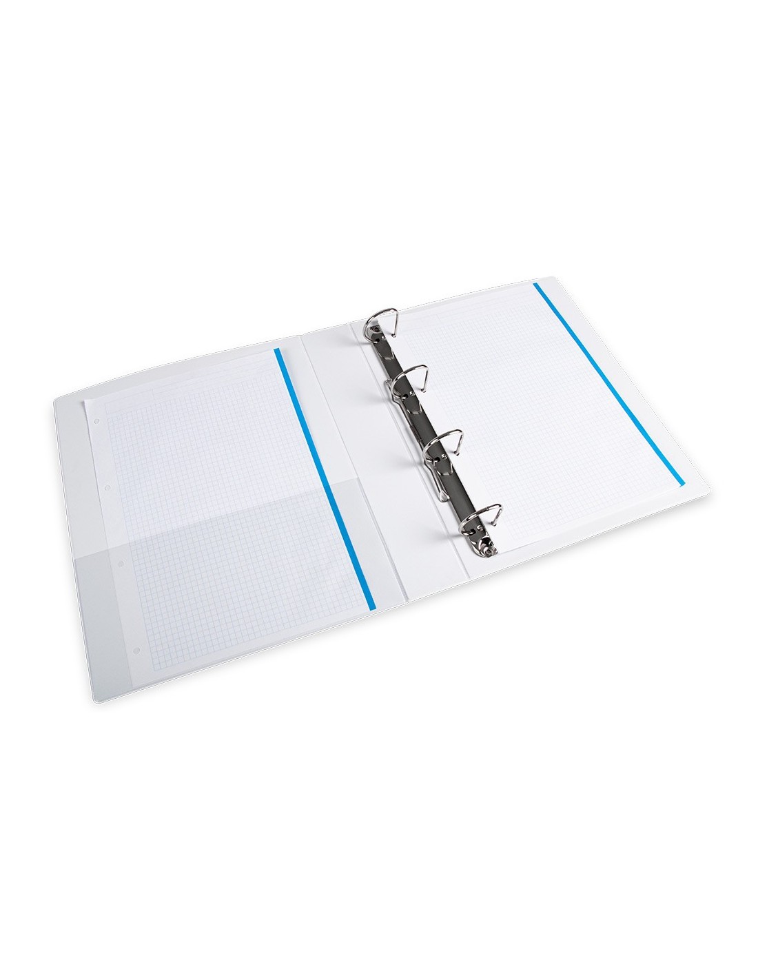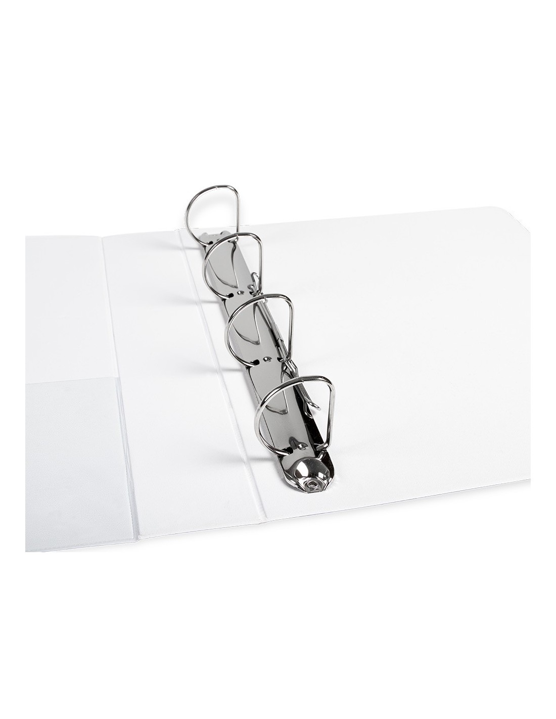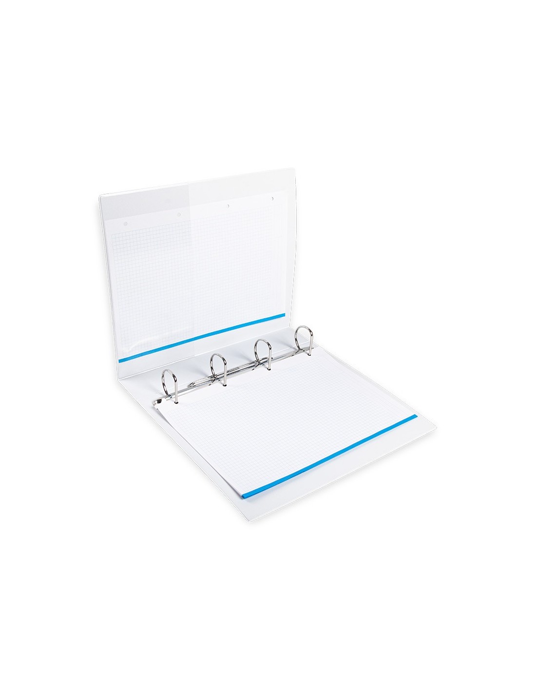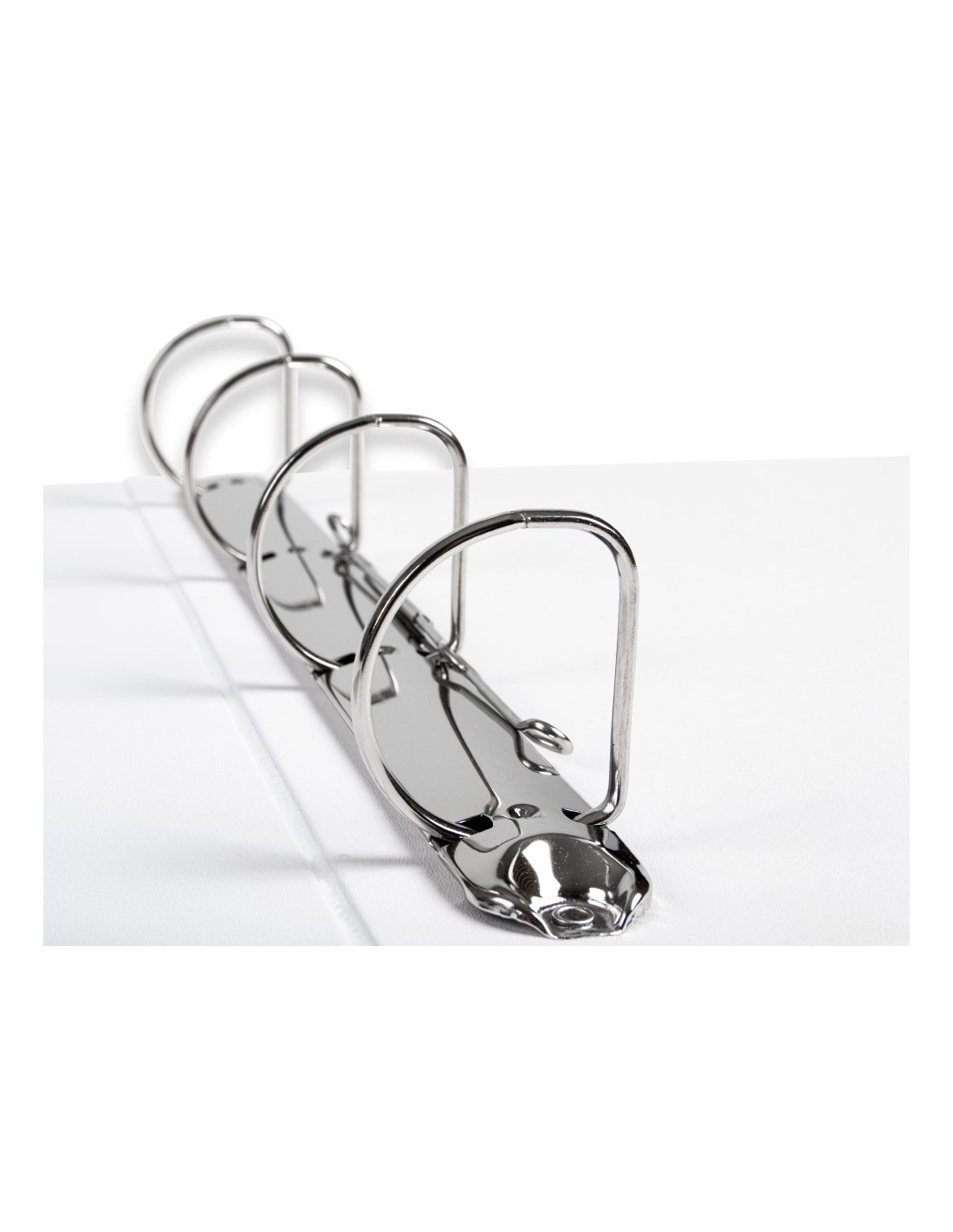 Carpeta fabricada en cartón forrado en plástico soldado de color blanco. 5 mm de grosor. Con funda transparente soldada en su interior. Carpeta con funda en la portada, contraportada y lomo que permite su personalización e identificación. Anillas mixtas. Con compresor metálico. Formato DIN A4. Medidas: 283 x 320 mm.