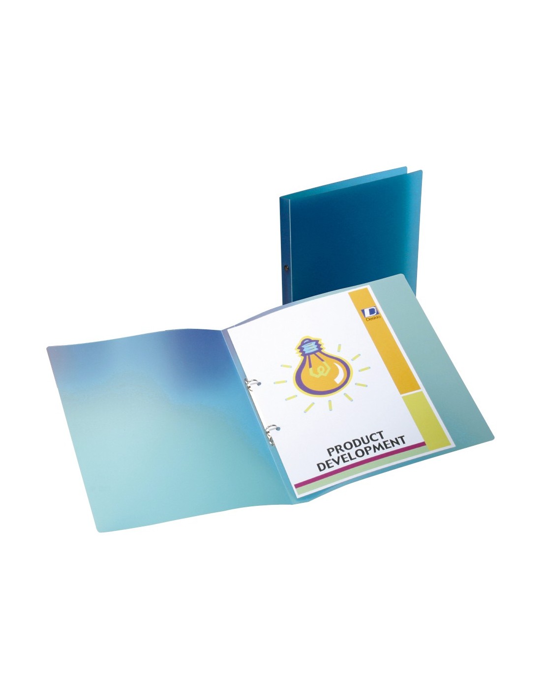 Carpeta de anillas de 15 mm fabricada en polipropileno translúcido. Disponible en 5 colores. 500 micras. Ancho de lomo: 17 mm. 2 anillas redondas de 15 mm. Formato DIN A4. Medidas: 245 x 315 mm.