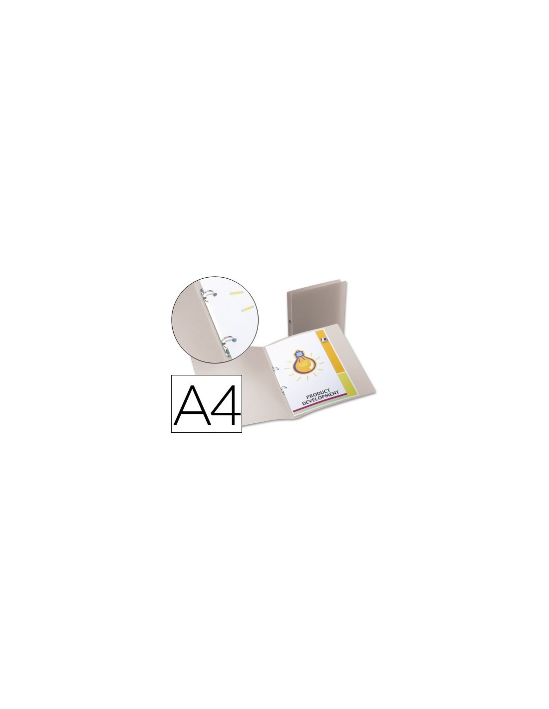 Carpeta de anillas de 15 mm fabricada en polipropileno translúcido. Disponible en 5 colores. 500 micras. Ancho de lomo: 17 mm. 2 anillas redondas de 15 mm. Formato DIN A4. Medidas: 245 x 315 mm.
