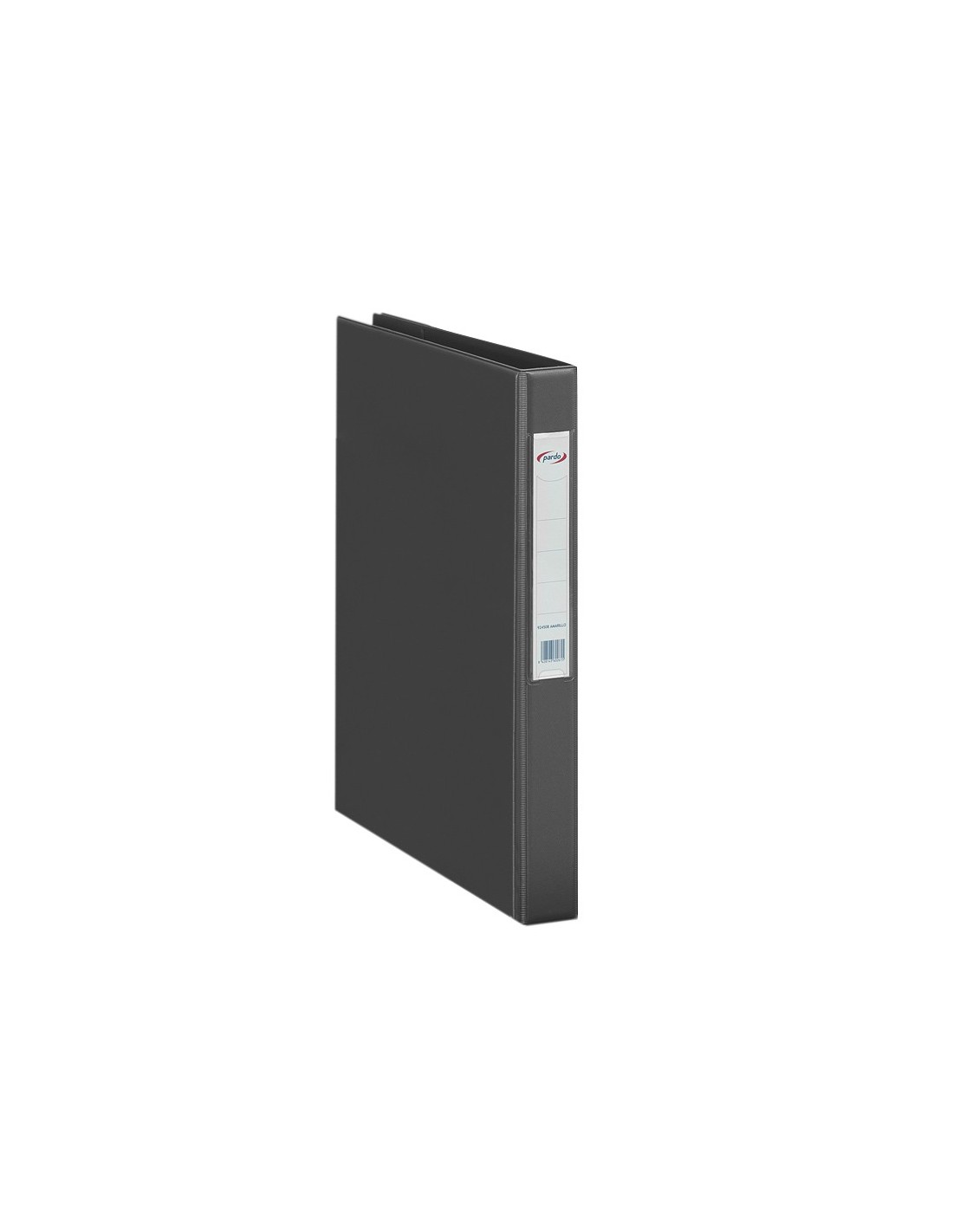 Carpeta de 2 anillas fabricada en cartón forrado en plástico soldado. 3 mm de grosor. Tarjetero en lomo y funda de plástico en interior de portada. Tamaño folio. Medidas: 285 x 335 mm.