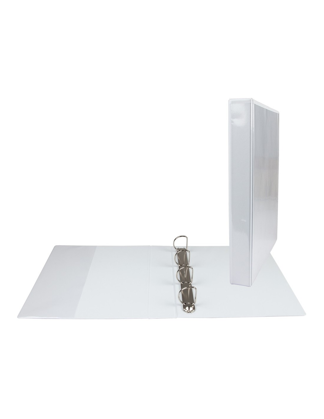 Carpeta de cartón forrado en PVC soldado blanco. 4 mm de grosor. 3 piezas con grabado en relieve estilo piel. Fundas en plástico transparente en portada, contraportada y lomo para personalizar. 2 fundas interiores. Anillas mixtas. Formato DIN A4+. Medidas: 285 x 317 mm.
