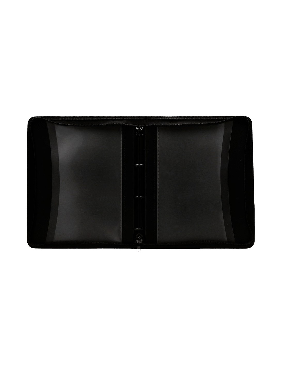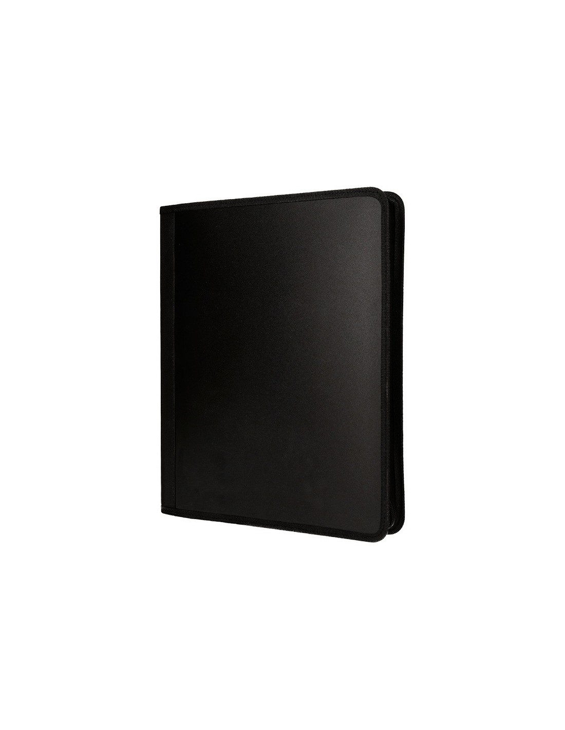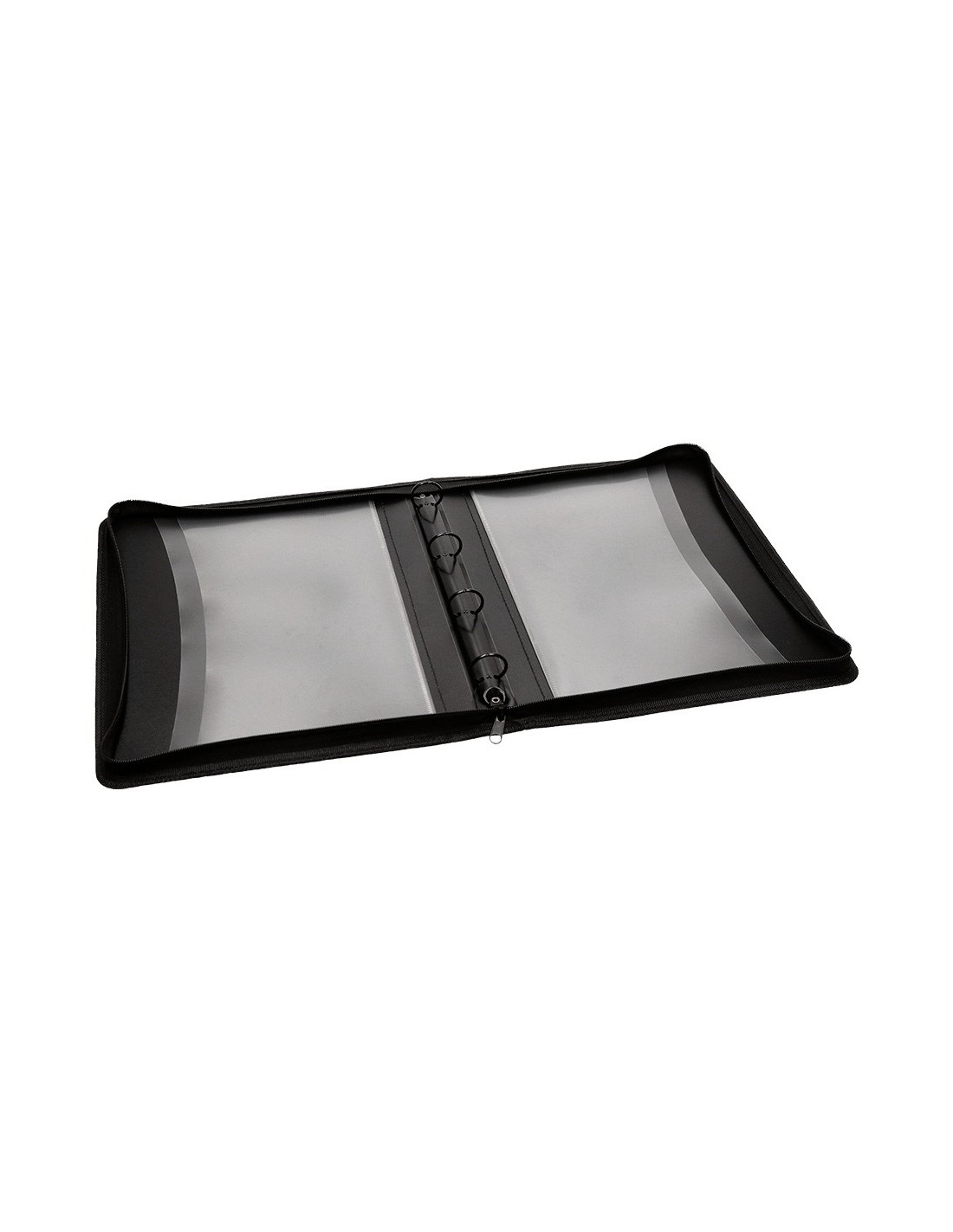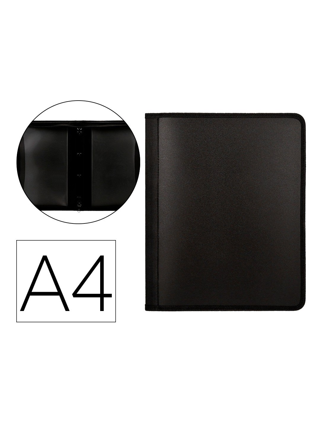 Carpeta con 4 anillas de 25 mm fabricada en polipropileno. 4 bolsillos interiores de 200 micras. Cierre con cremallera. Ribete negro en su perímetro que le da una mayor prestancia. 750 micras. Ancho de lomo: 30 mm. Formato DIN A4. Medidas: 340 x 275 mm.