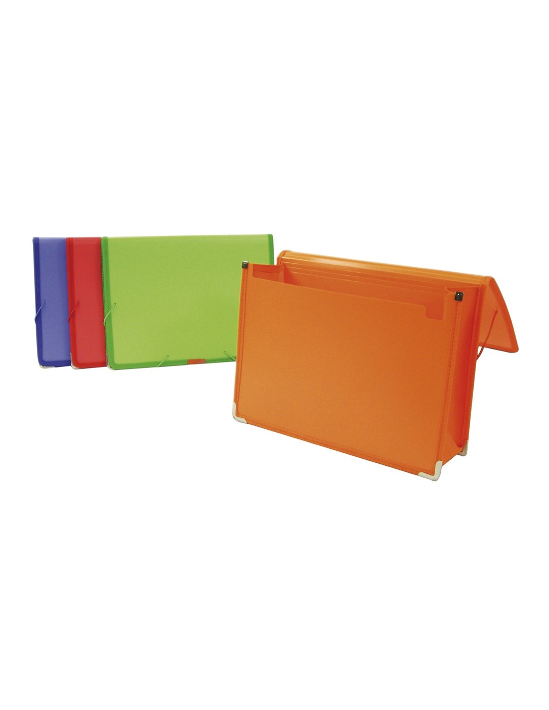 Carpeta portadocumentos con gomas. Fabricada en polipropileno. Lomo flexible de 100 mm con cantoneras. Formato DIN A4. 1000 micras. Medidas: 480 x 320 x 240 mm. Presentación: 16 unidades surtidas: azul, naranja, rojo y verde.