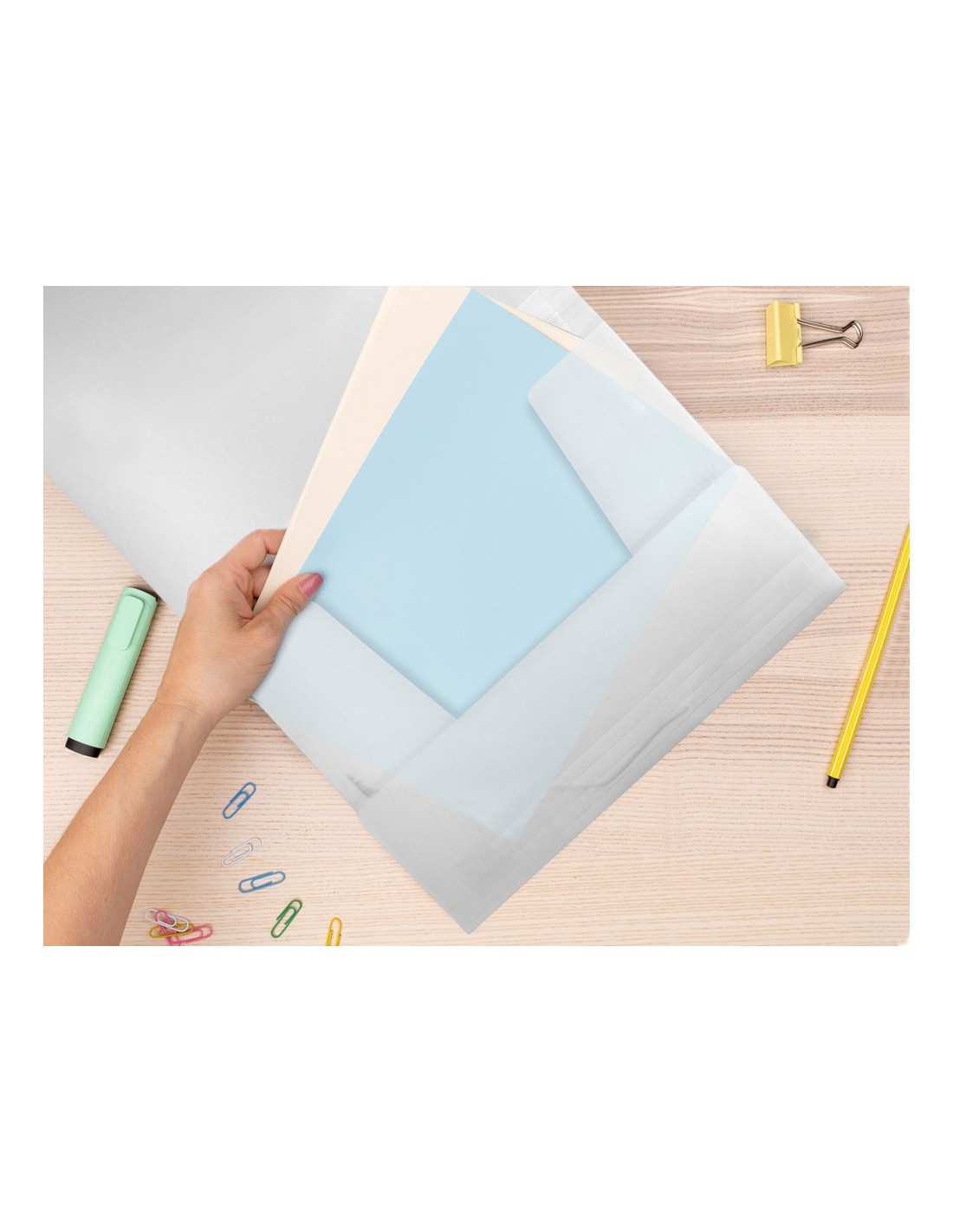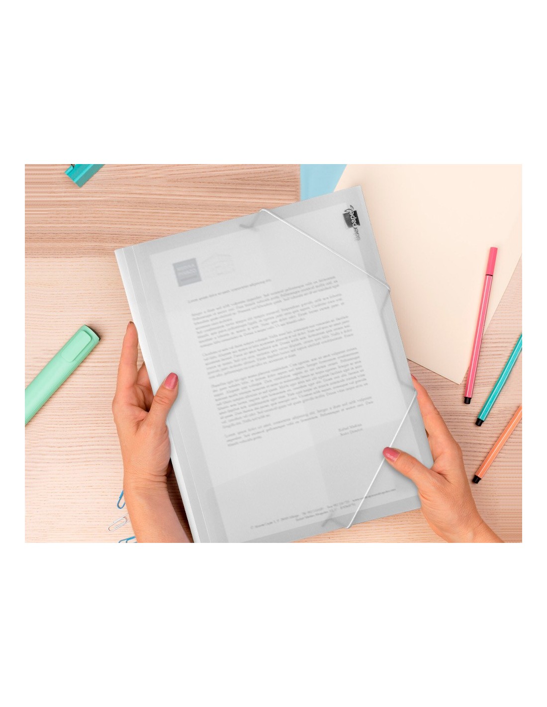 Fabricada en polipropileno. Cierre por gomas. Lomos flexibles. Capacidad 100 hojas. 400 micras. Formato DIN A4.