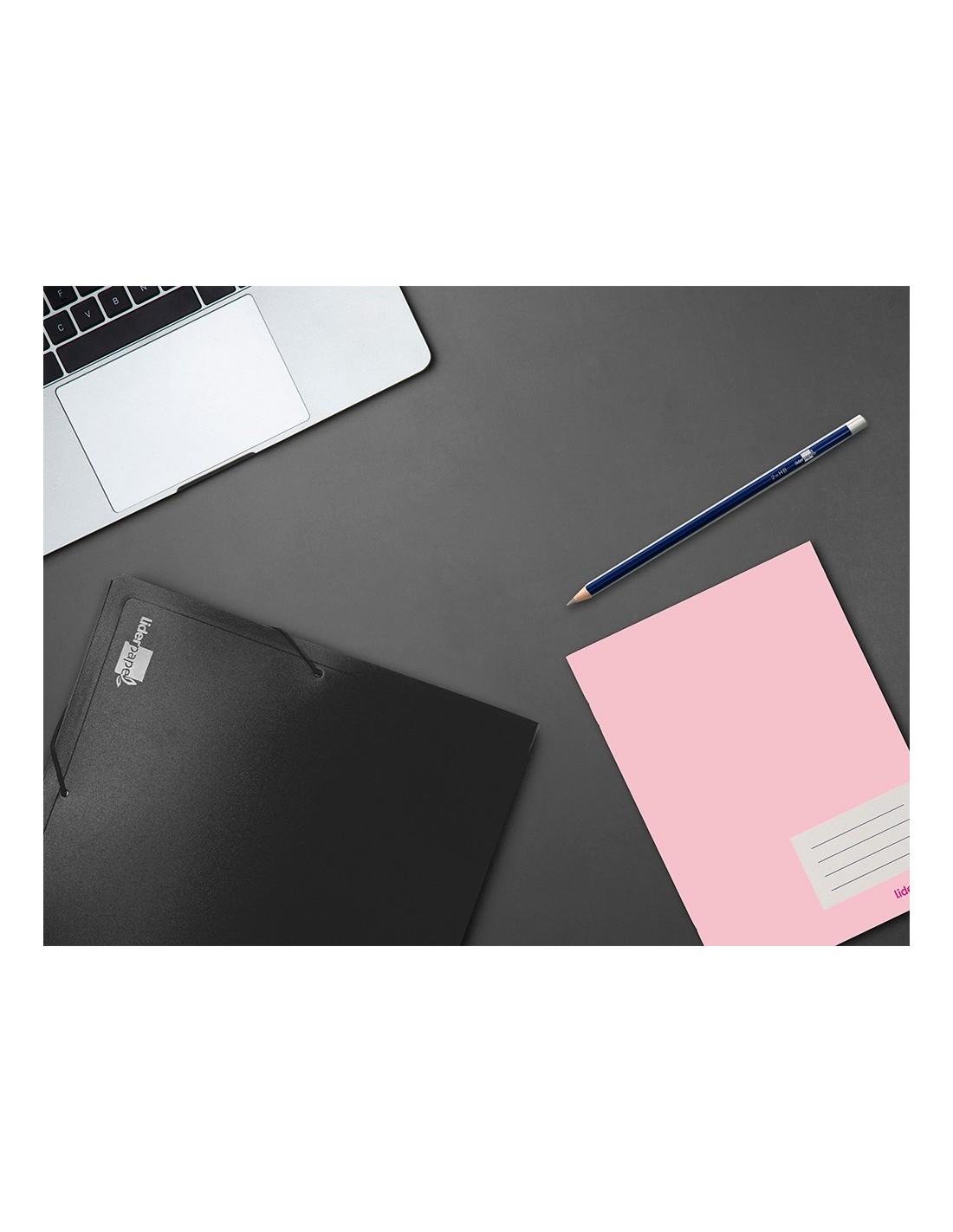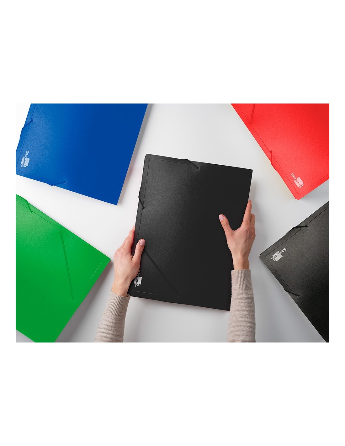 Fabricada en polipropileno. Cierre de gomas. 2 bolsillos para CD's. Lomo personalizable. Colores opacos. Capacidad 200 hojas. Lomo rígido 50 mm. 700 micras.