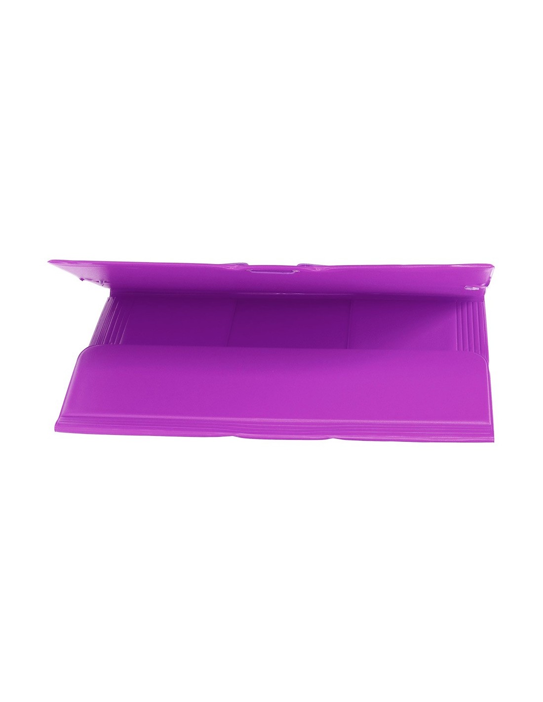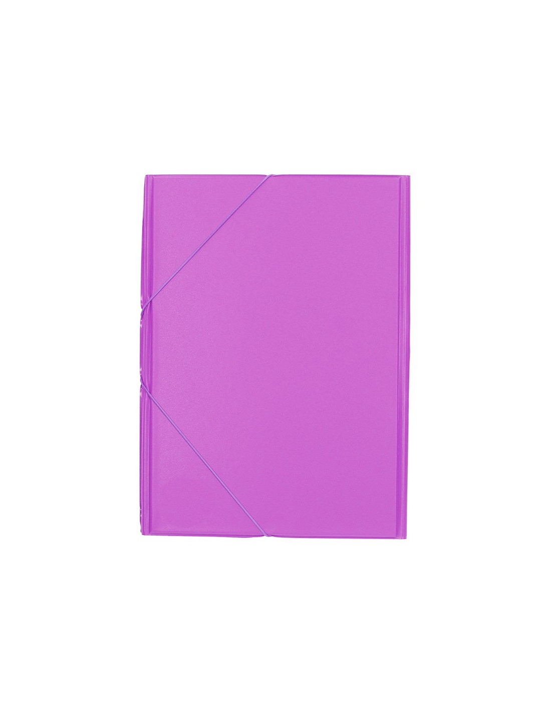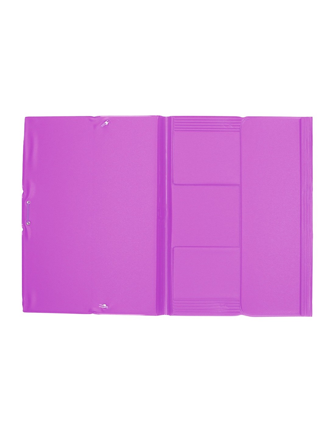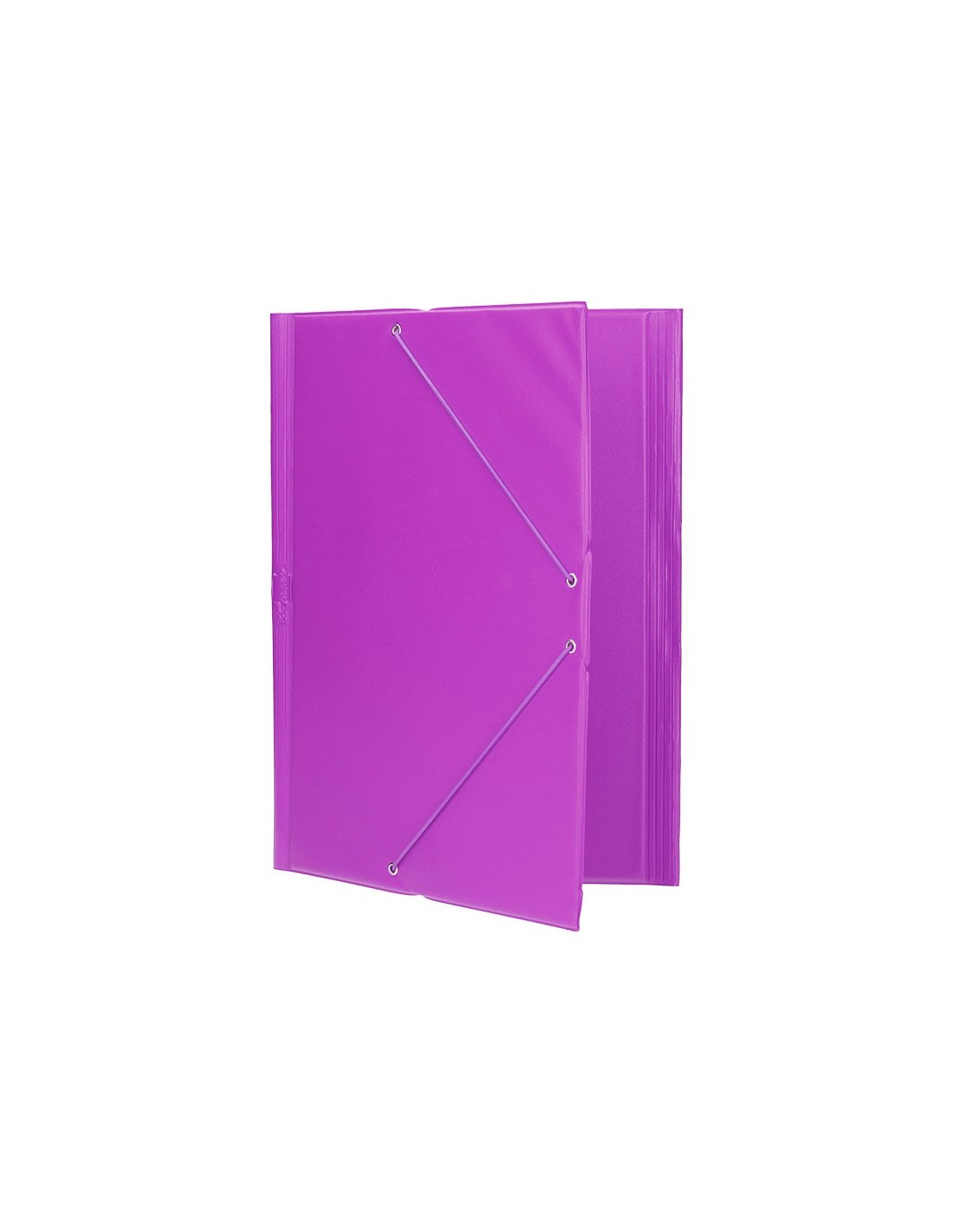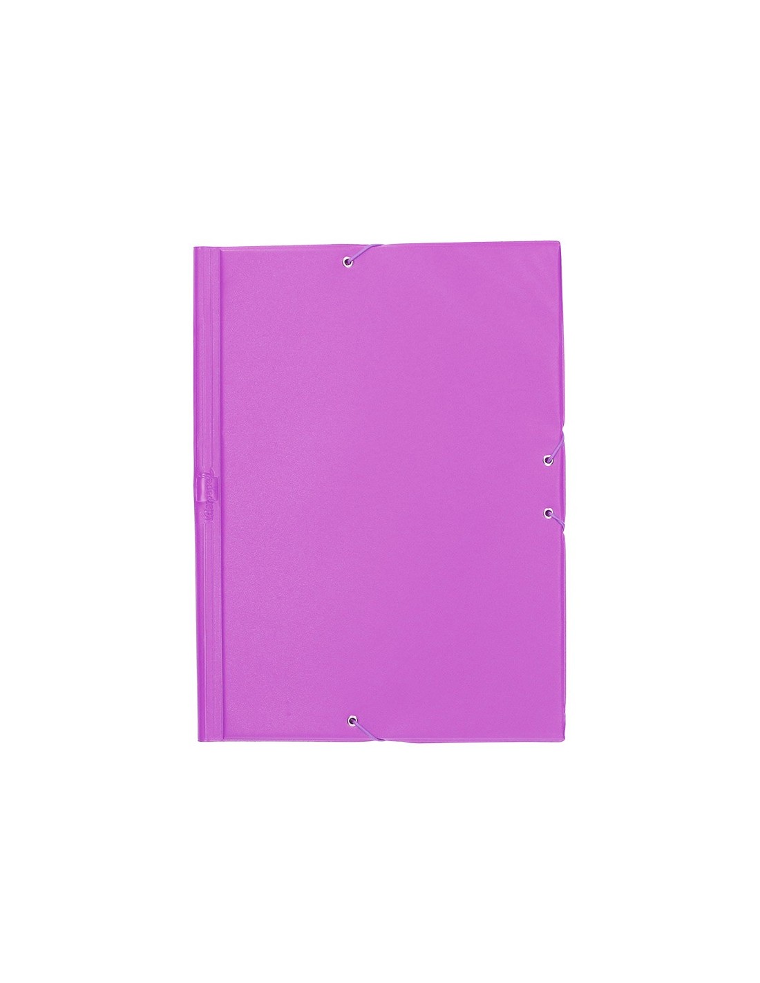 Carpeta fabricada en cartón forrado en plástico soldado. 3 mm de grosor. Colores brillantes y vivos. Cierre por gomas. Lomo flexible. Tres solapas. Tamaño folio.