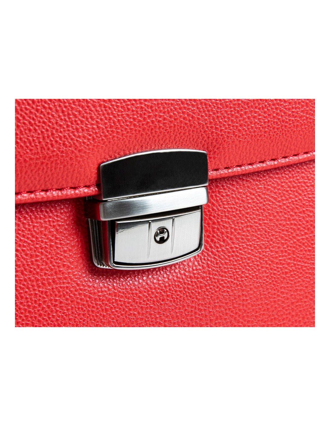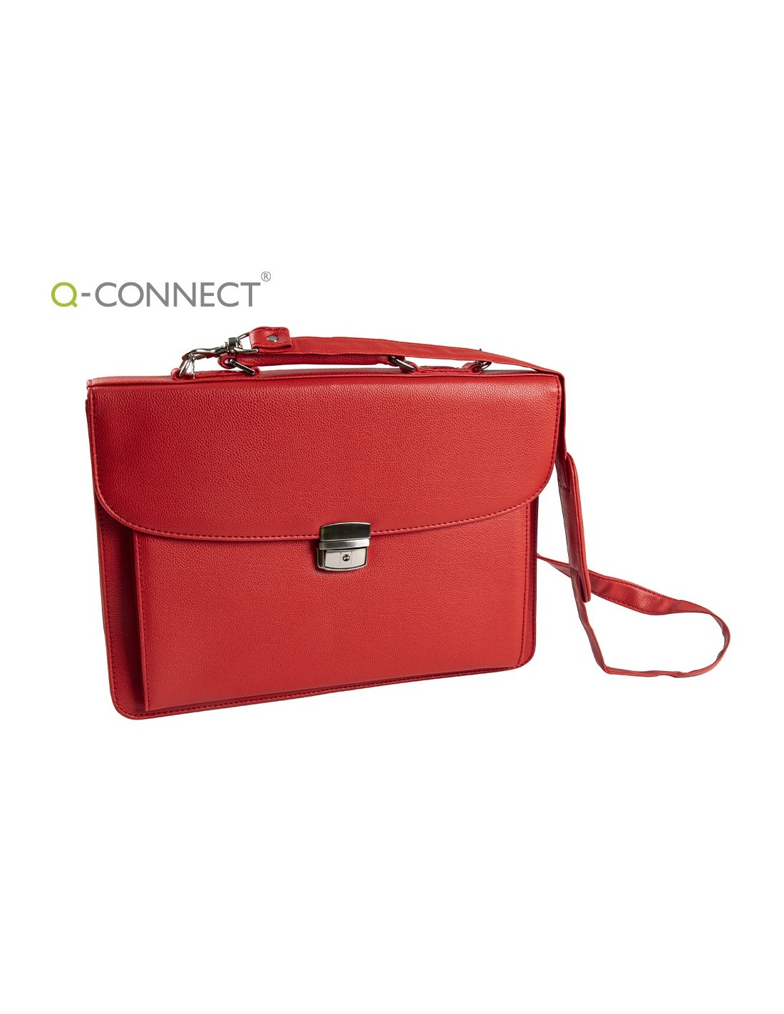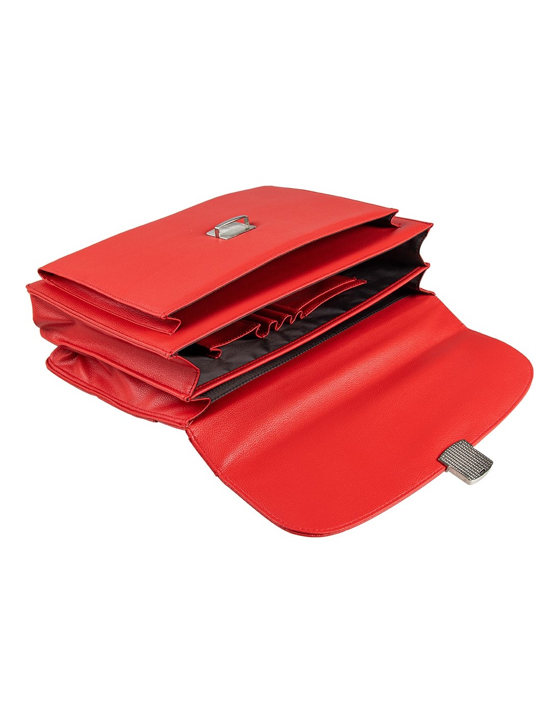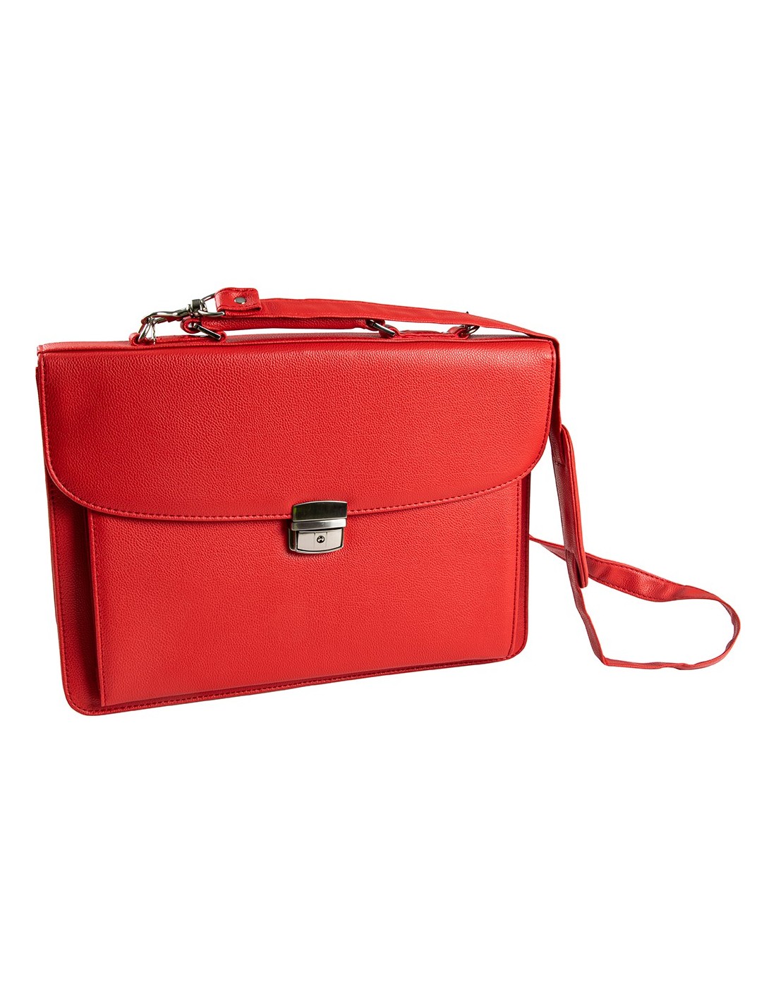 Fabricada en polipiel con efecto granulado. Contiene 2 compartimentos interiores grandes para guardar un portátil o carpetas y uno delantero más pequeño para guardar los cables del portátil o pequeños artículos. Soporte para bolígrafos, tarjetas y móvil. Asa y cinta bandolera ajustable. Color rojo. Medidas: 390 x 280 x 115 mm.