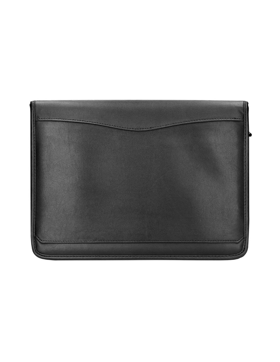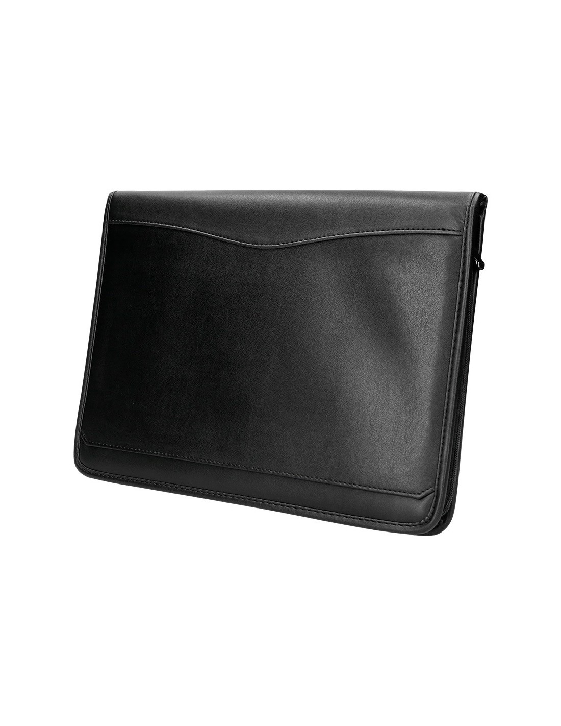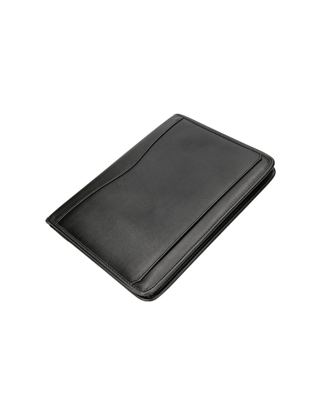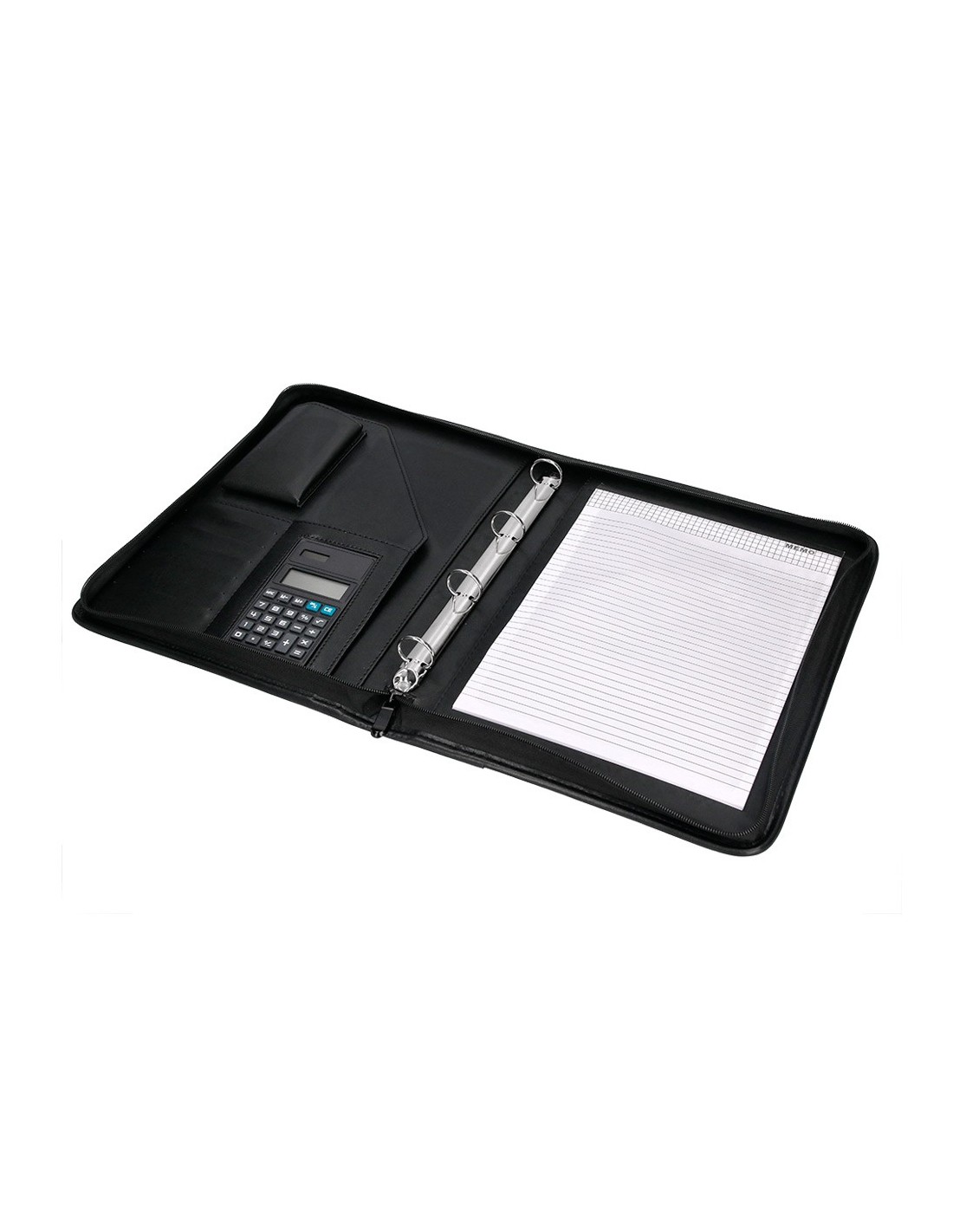Fabricada en plástico con tacto piel de primera calidad. Cierre con cremallera, bloc para notas, soporte para bolígrafo, calculadora, tarjetero bolsillo para móvil y un departamento tipo solapa. Formato DIN A4. Medidas: 260 x 355 x 10 mm.