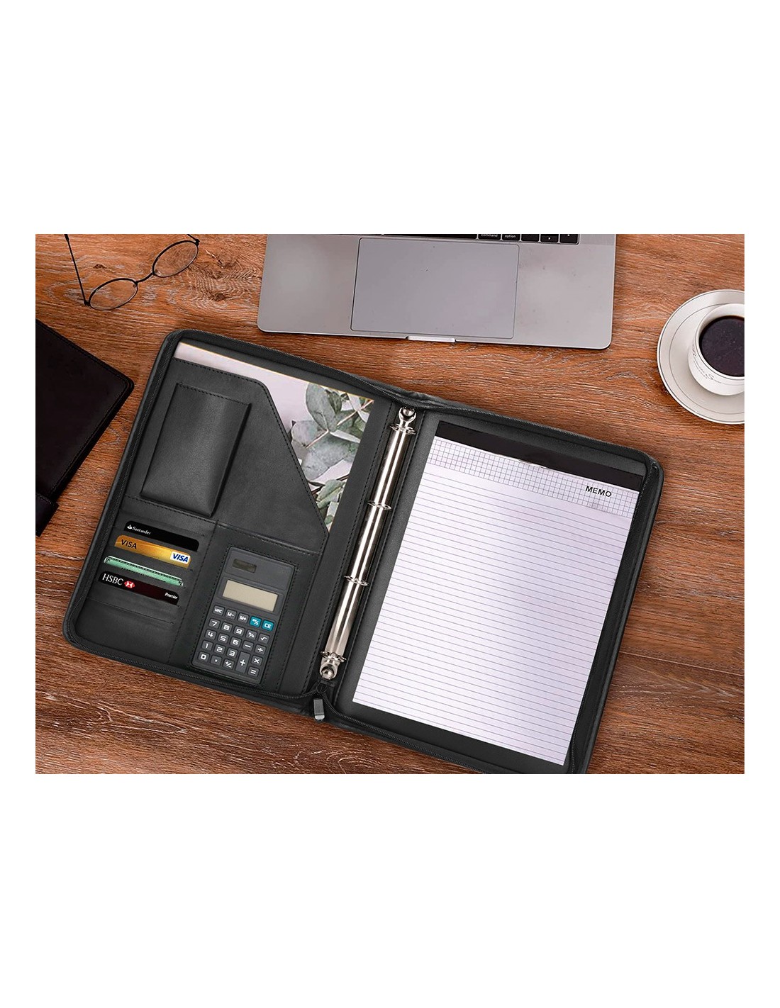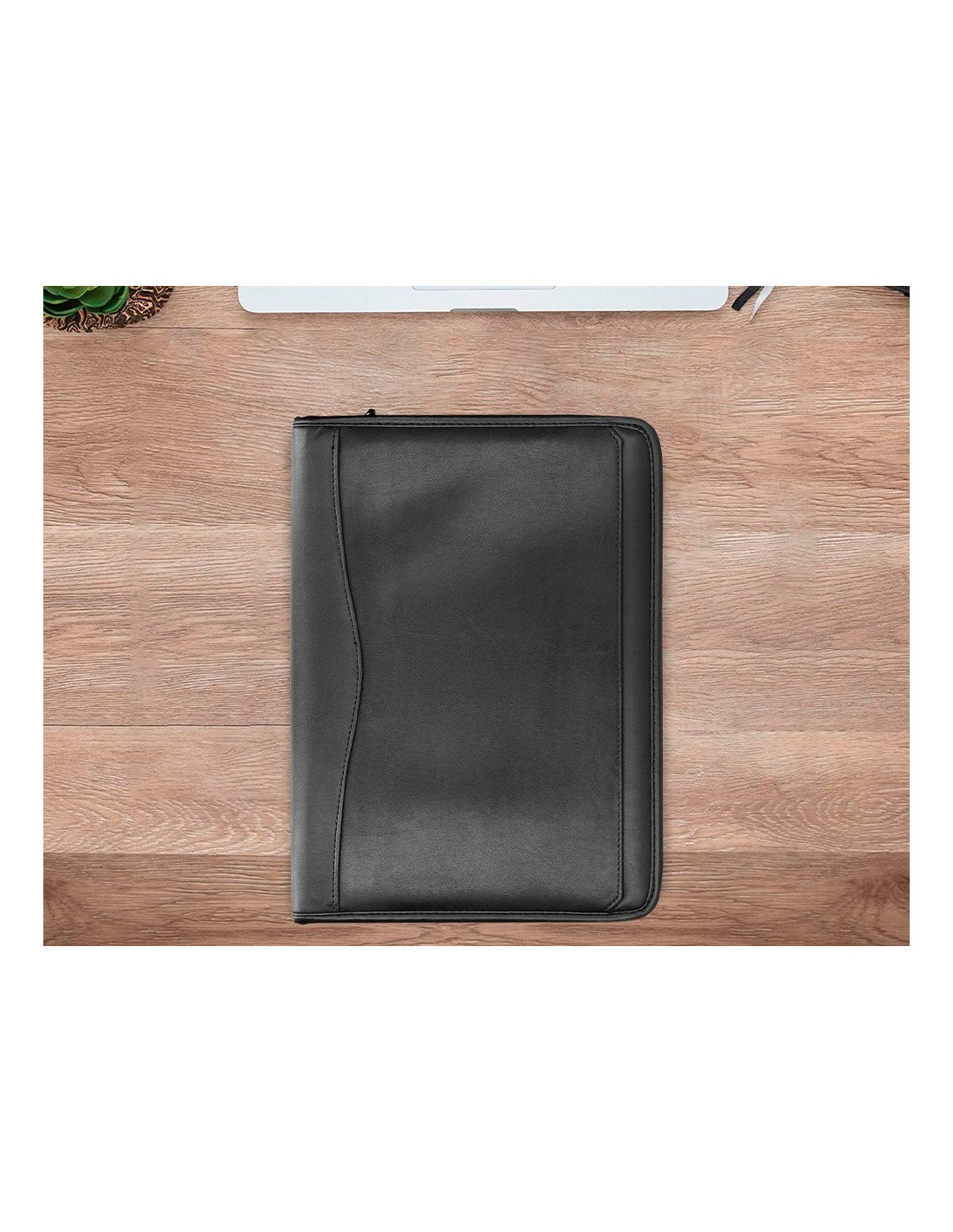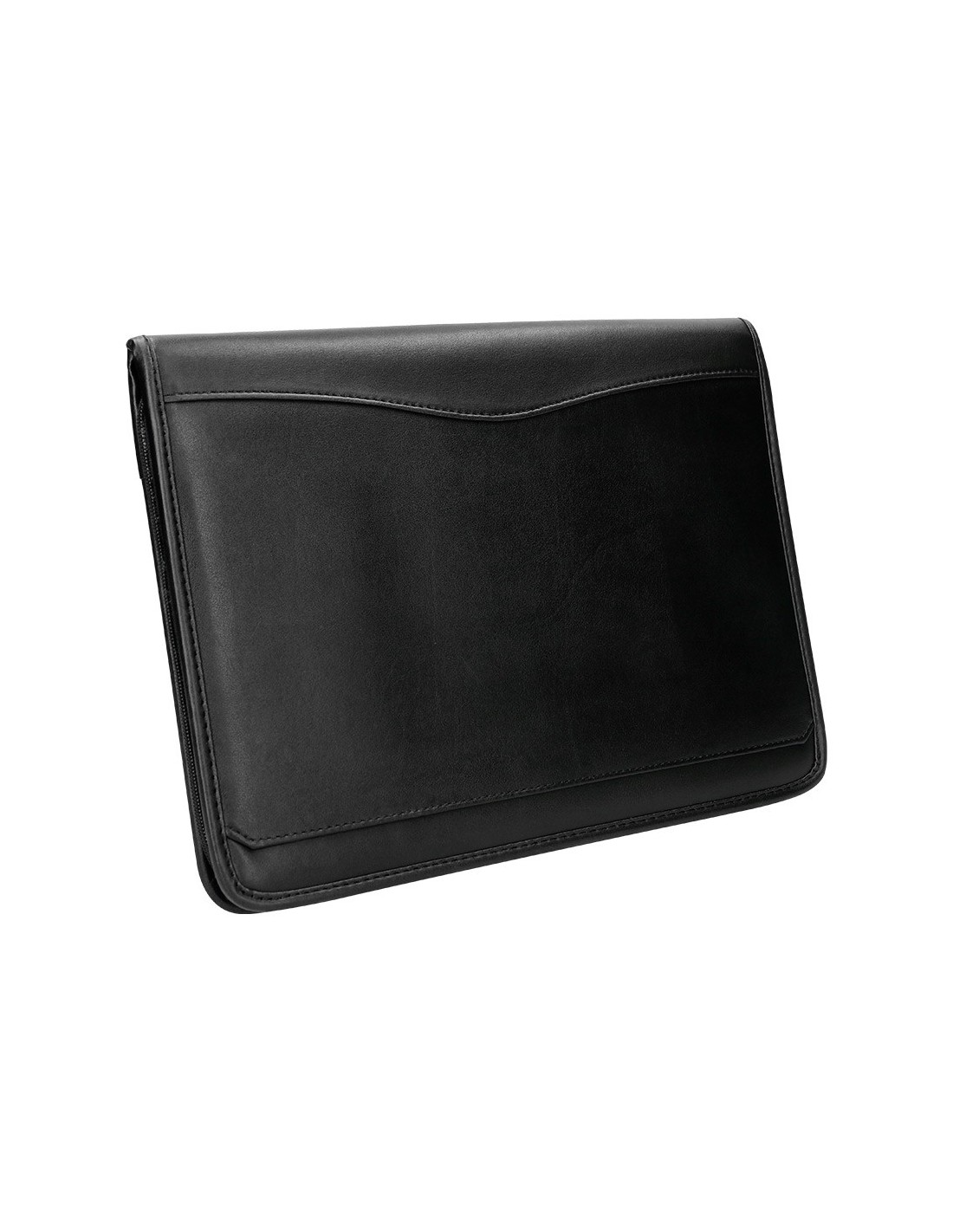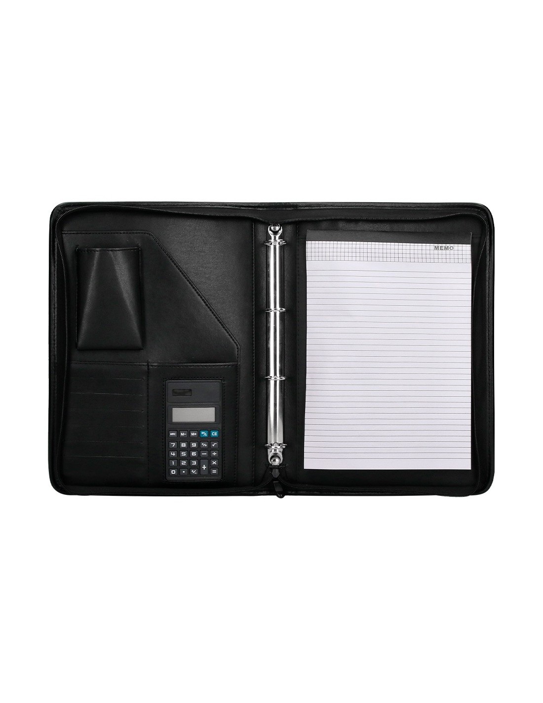 Fabricada en plástico con tacto piel de primera calidad. Cierre con cremallera, bloc para notas, soporte para bolígrafo, calculadora, tarjetero bolsillo para móvil y un departamento tipo solapa. Formato DIN A4. Medidas: 260 x 355 x 10 mm.