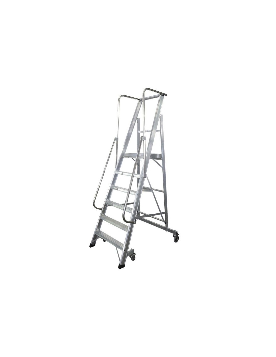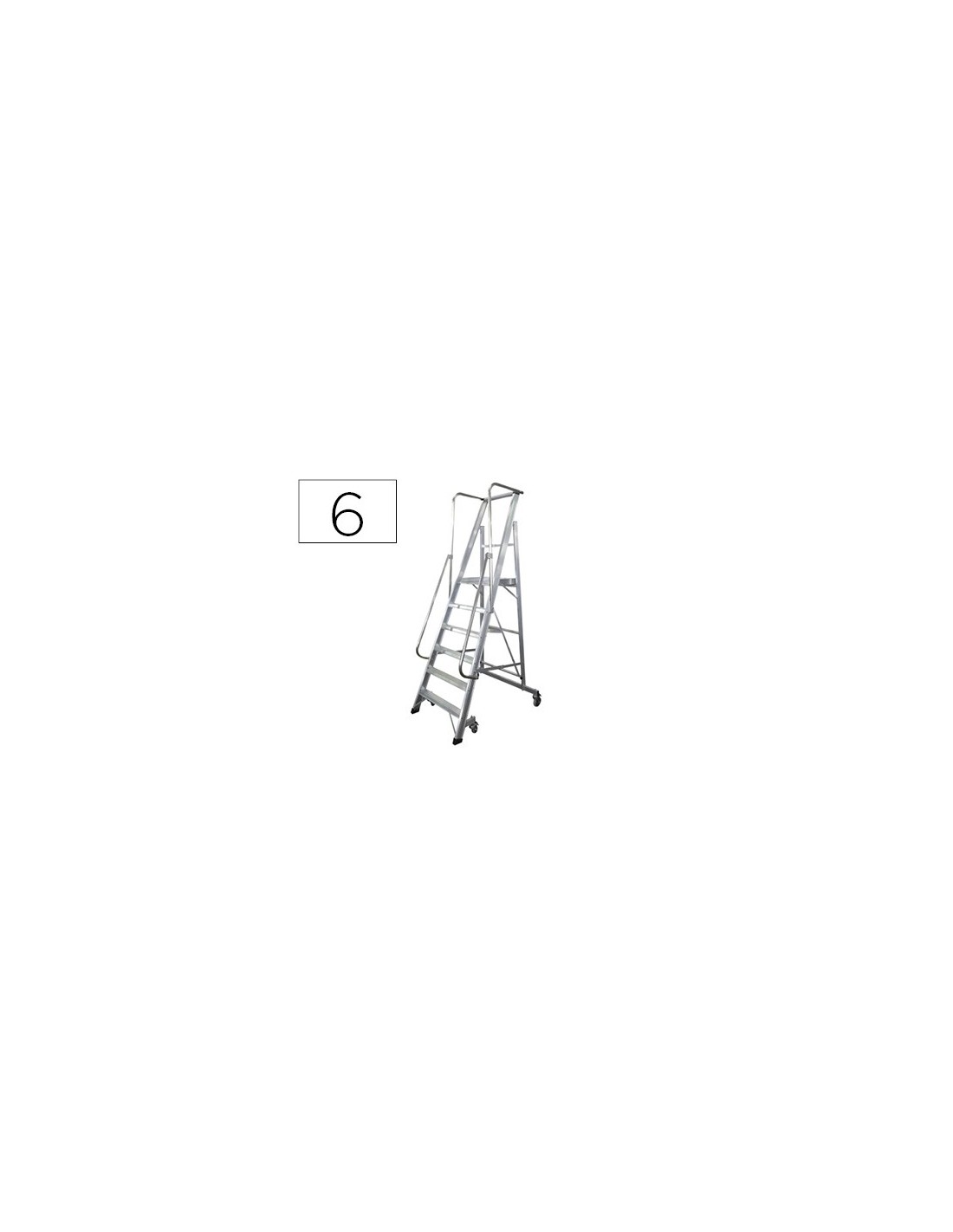 Escalera industrial. Construida con perfiles de aluminio de extrusión con 6 peldaños. Escalones de 8 cm con relieves antideslizantes, atornillados. Altura entre escalones de 25 cm. Plataforma de trabajo de 45 × 45 cm, zócalo y guardacuerpos de 95 cm en aluminio. Pasamanos a ambos lados a partir de 1 m de altura de plataforma. Tirantes de seguridad en aluminio a partir de 6 peldaños. Bandeja para herramientas. Cuatro ruedas giratorias con freno: dos delanteras de ø7,5 cm y dos traseras de ø12,5 cm. Grandes tapas finales de PVC antideslizante. Soporta hasta 150 kg. Altura hasta plataforma: 140 cm. Altura en tijera: 340 cm. Ancho inferior frontal: 105 cm. Ancho superior frontal: 73 cm. Peso 22 kg.