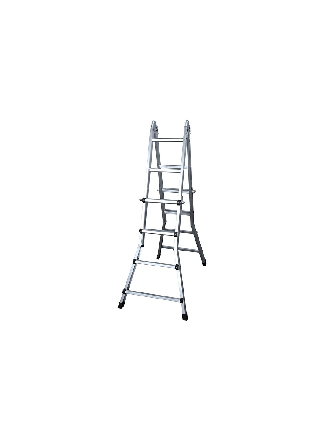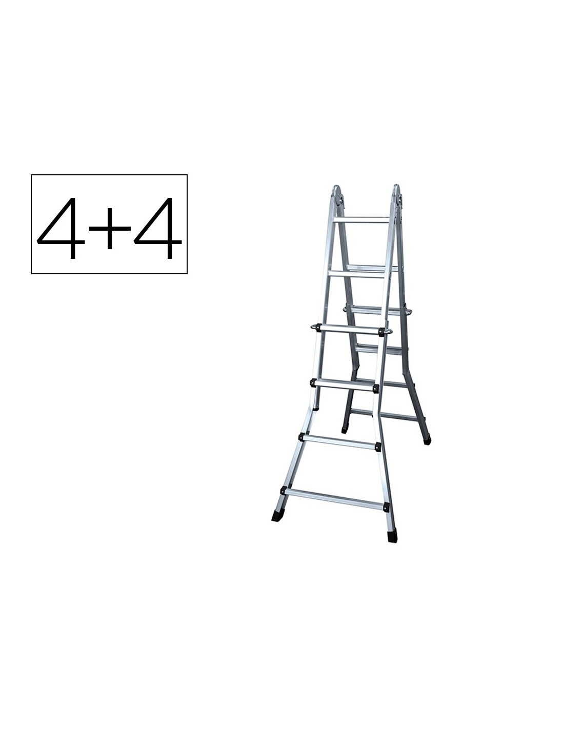 Escalera telescópica de aluminio con 4 + 4 peldaños engastados con relieves antideslizantes. Cumple la norma EN131-4. Tapafinales de PVC antideslizantes. Altura en tijera: 300 cm. Bisagras de acero con sistema de bloqueo. Sistema telescópico de posicionamiento de aluminio de fundición. Diseñada para soportar 150 kg.
