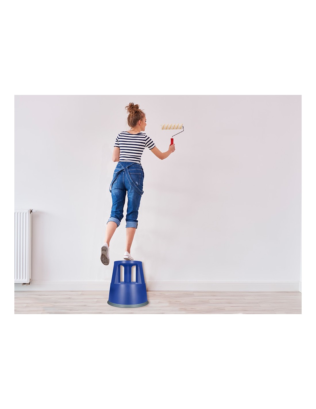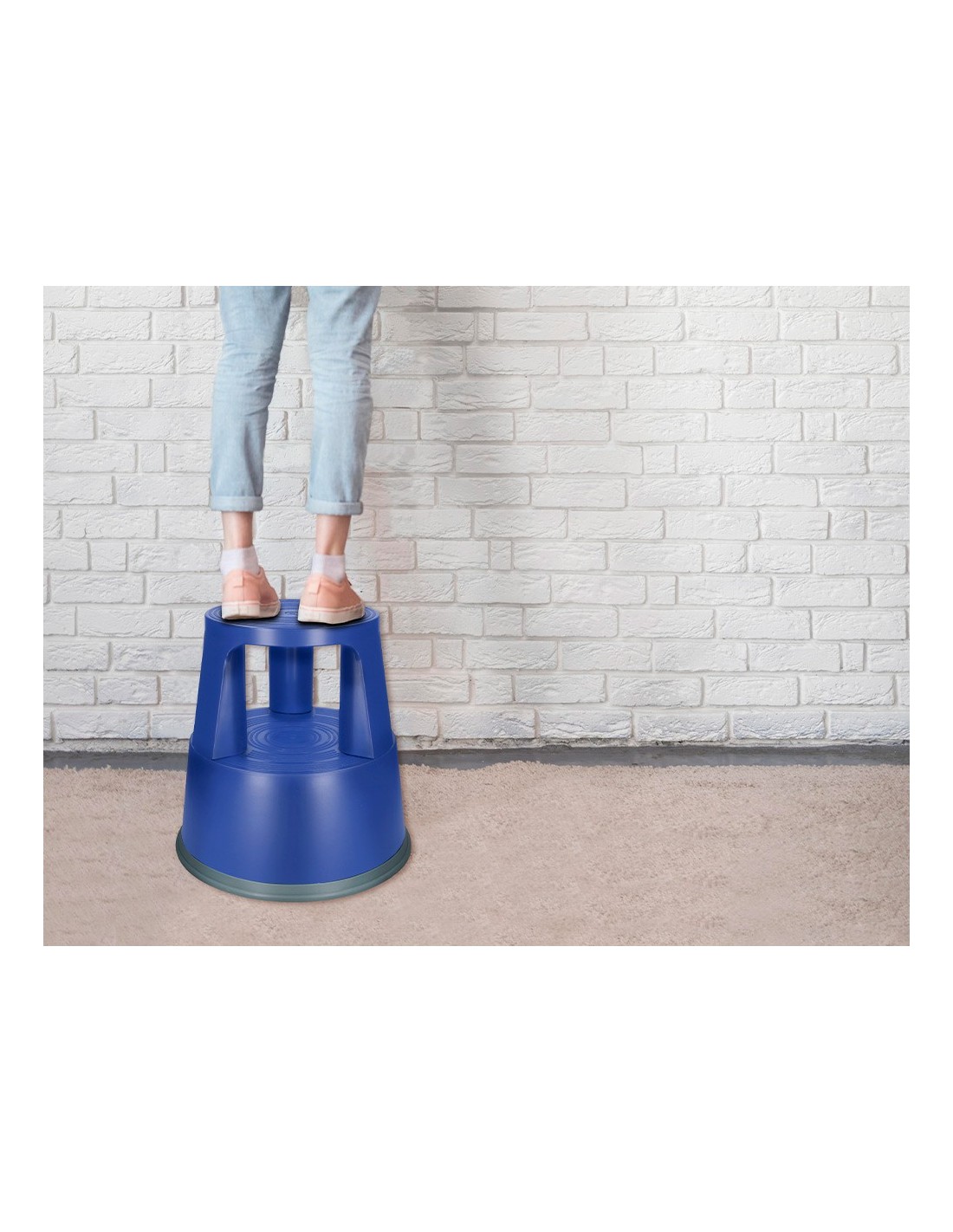 Taburete altamente resistente y firme. Fabricado en ABS. Con ruedas de gomas retráctiles que lo hace muy fácil de transportar y firme a la vez, al permanecer fijo en el suelo. Con dos niveles. Soporta hasta 150 kg. Medidas: Ø 43,5 x 43 x Ø 28 cm.