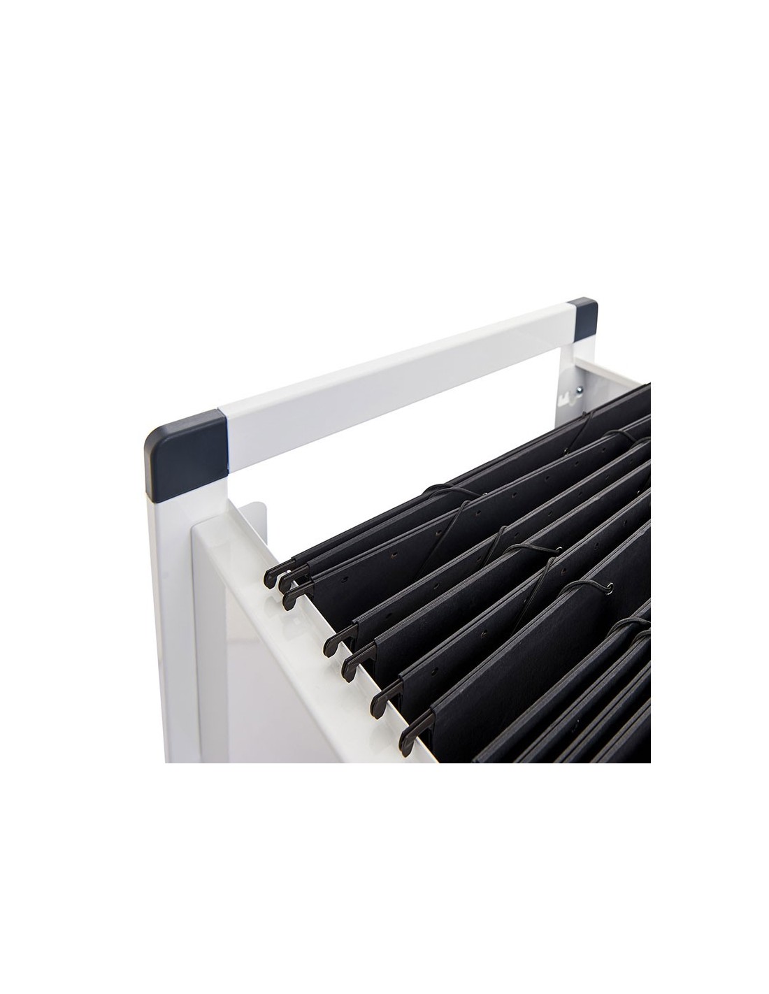 Carro extensible para carpetas colgantes formato DIN A4, folio o folio prolongado. Capacidad aproximada: 45 carpetas. Tapa lateral que impide que caigan los contenidos. Con ruedas. Color gris texturado. No incluye carpetas. Medidas: 405 x 690 x 600 mm.