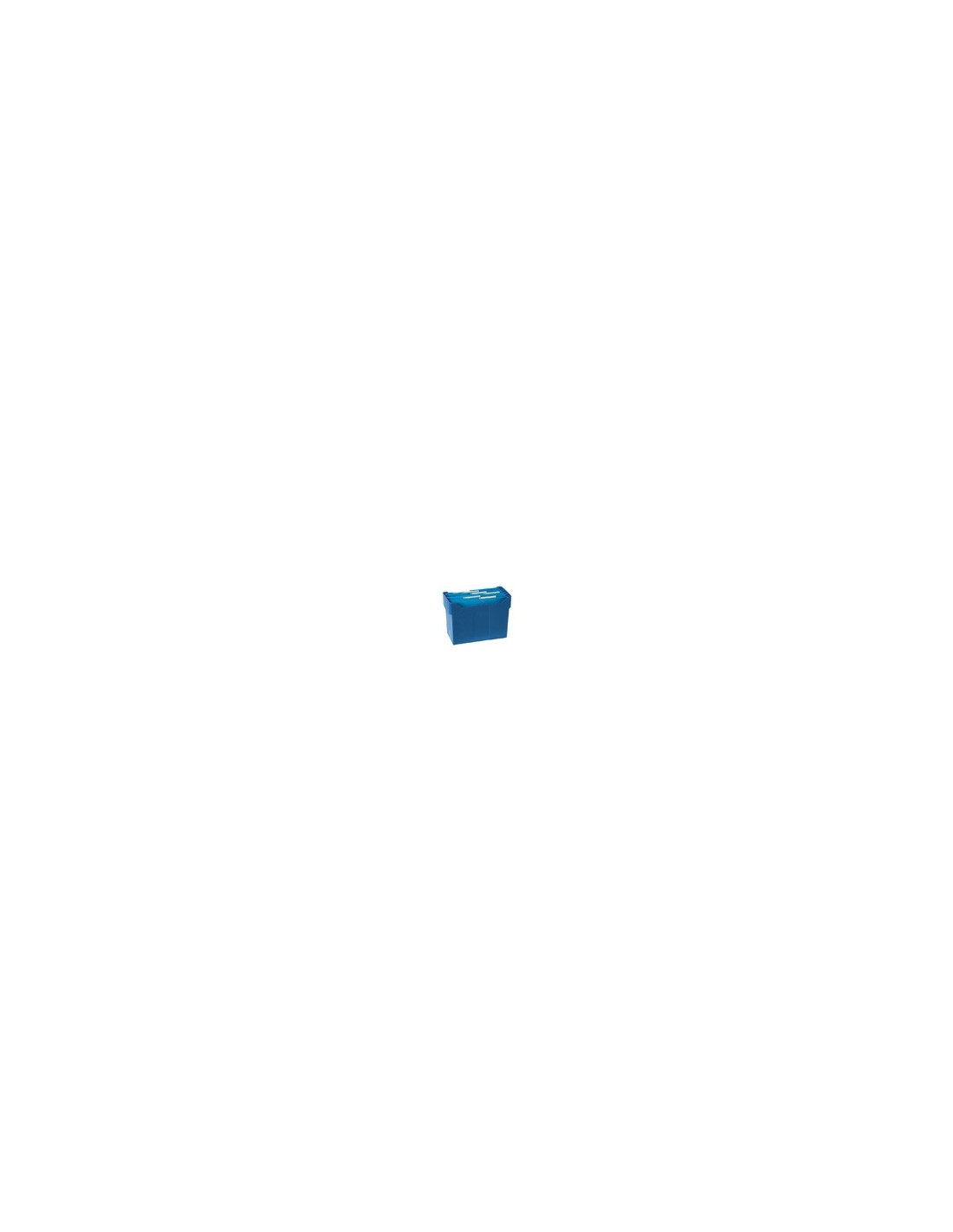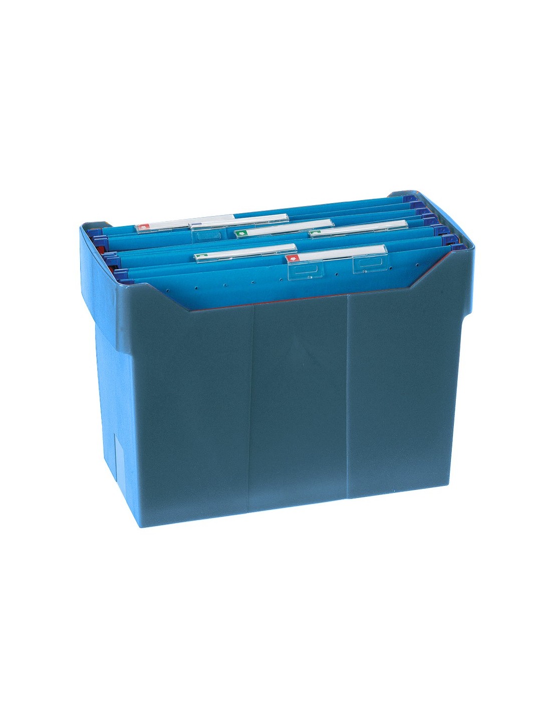 Cajetín de archivo sostenible Archivo 2000 Archibox. Fabricado en poliestireno 100% reciclado y reciclable. Válido para carpetas colgantes A4 (no incluidas). Su diseño con asas laterales permite el archivo y transporte de aproximadamente 20 carpetas colgantes. Color azul. Medidas exteriores: 365x170x260 mm. Fabricado en España.