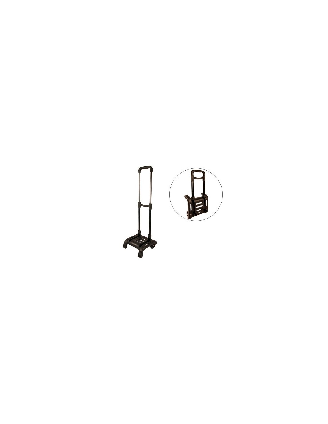 Plegable, para ahorrar espacio en casa. Asa extensible. 2 ruedas. Adaptable a la mayoría de mochilas que se pueden acoplar a carritos. Medidas: 860 x 280 x 260 mm.