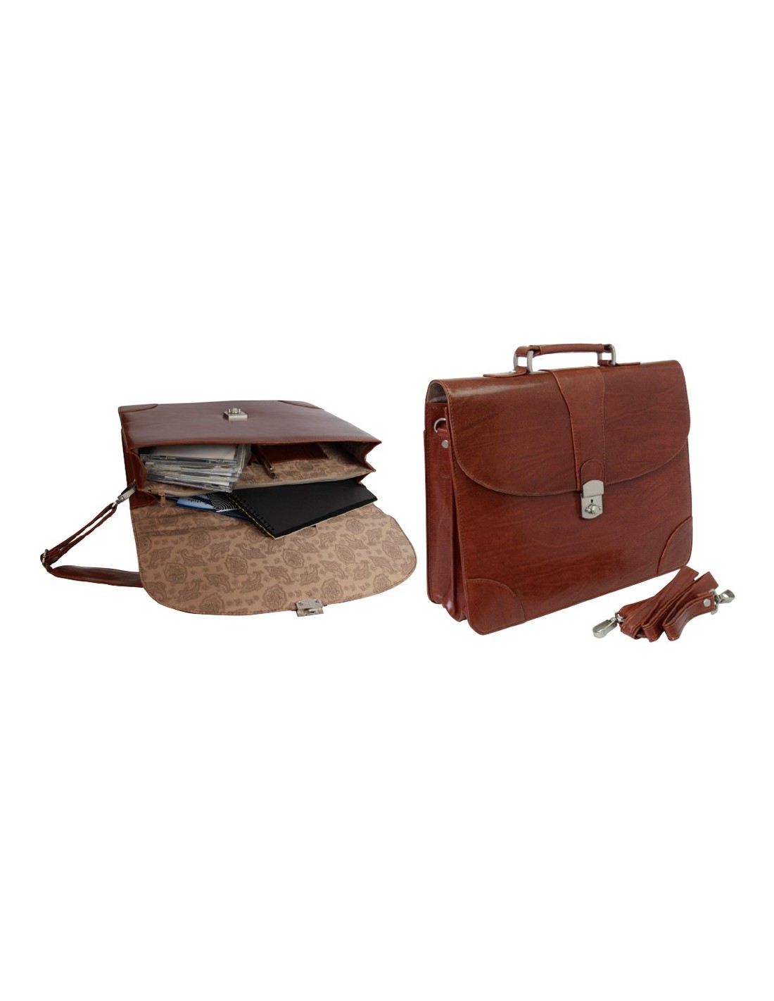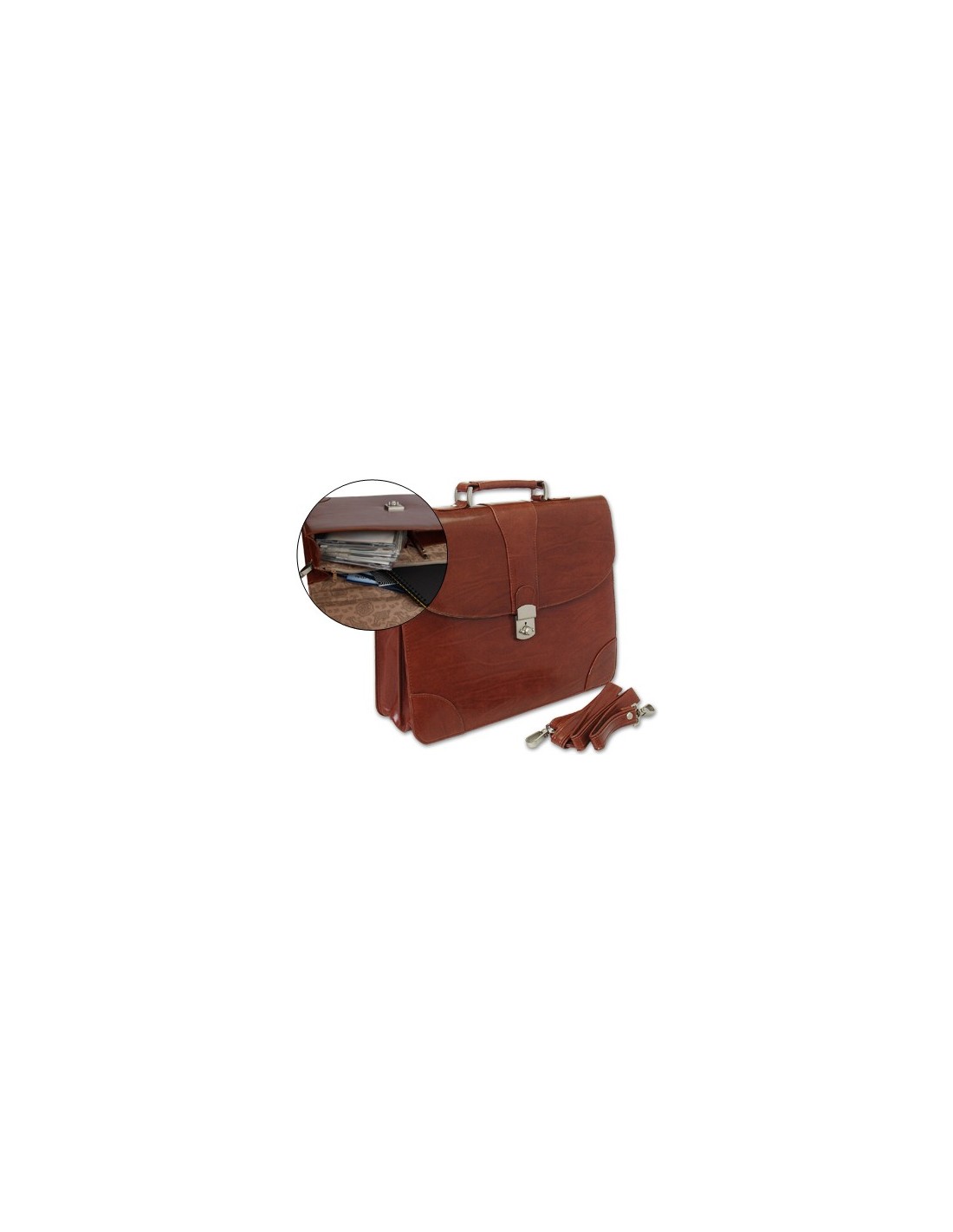Fabricada en polipiel. Cierre metálico con llave. Asa y cinta bandolera, tres departamentos interiores, uno con cremallera. Soporte para bolígrafos y tarjetas. Color marrón con detalles en plata. Medidas: 406 x 318 x 79 mm.