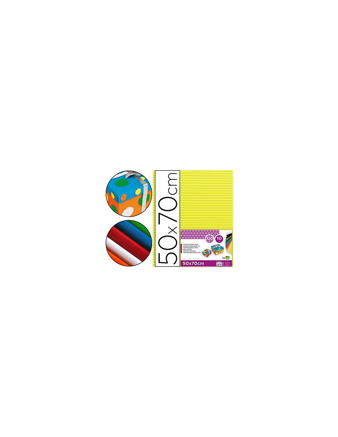 Cartón ondulado de 320 g/m². Gran resistencia y colores intensos. Presentación en bolsa de celofán. Medidas de la hoja: 50 x 70 cm.