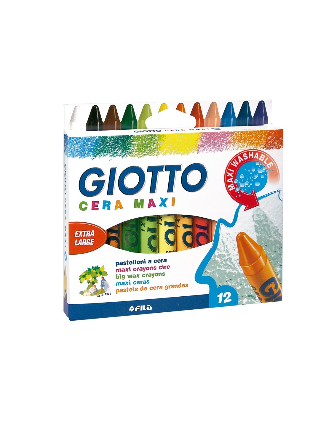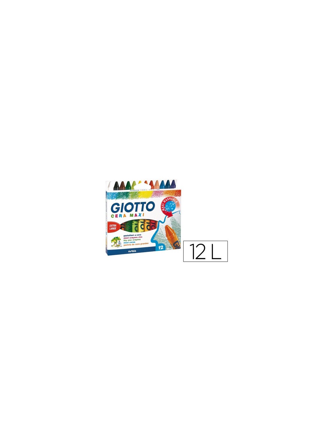Pastel de cera en colores vivos. Lavables en la mayor parte de tejidos y superficies no porosas. Tamaño maxi. Medidas de la cera: Ø 11,5 x 100 mm. La caja de 12 lápices.