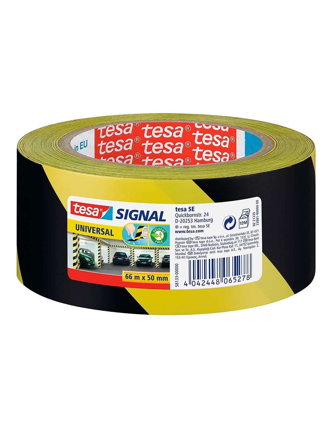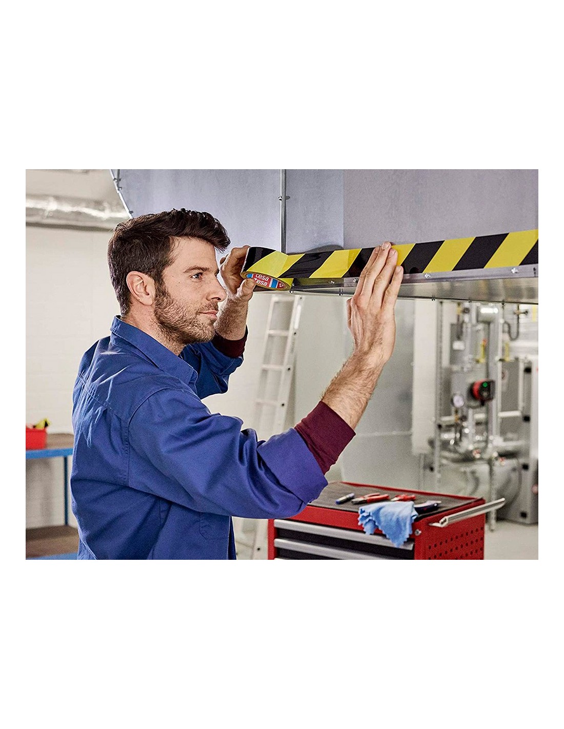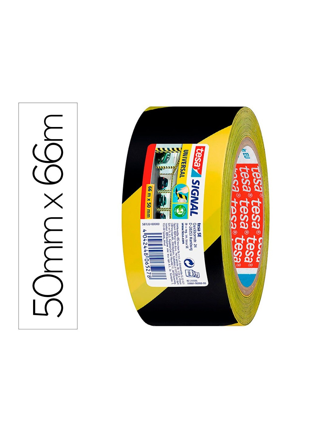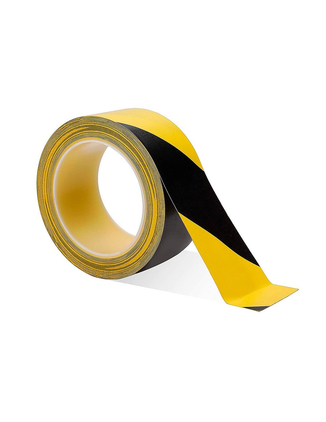 Tira adhesiva de polipropileno, ideal para indicar o delimitar zonas. Color amarillo - negro. Medidas: 66 m x 50 mm.