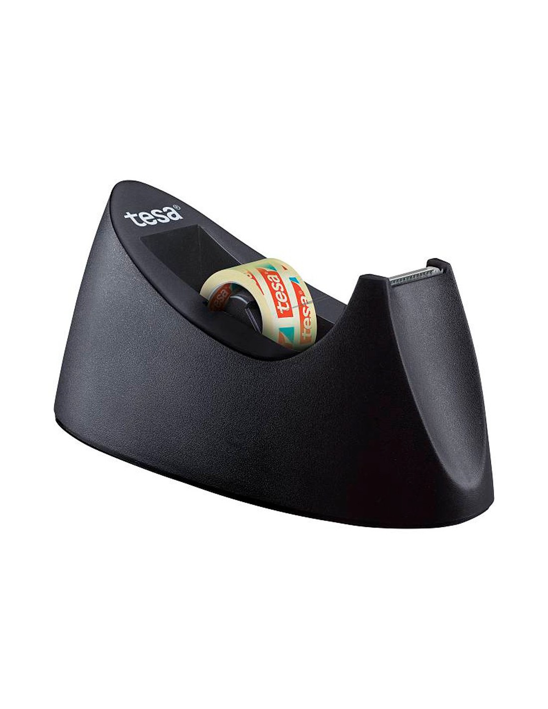 Portarrollos de sobremesa de plástico. Antideslizante y estable, su peso garantiza una colocación segura. Corte limpio gracias a la afilada cuchilla dentada. Con alfombrilla protectora bajo el dispensador que evita arañar el escritorio u otros muebles. Incluye cinta adhesiva. Color negro. Para cintas de 33 m x 19 mm. Medidas: 194 x 90 x 75 mm.