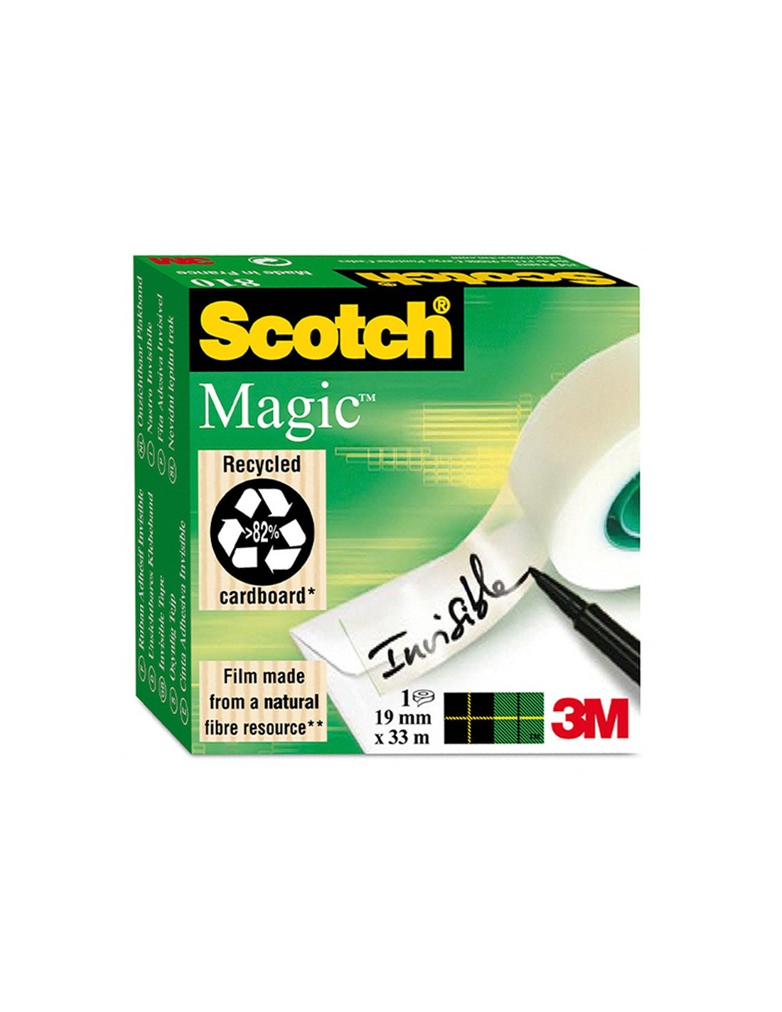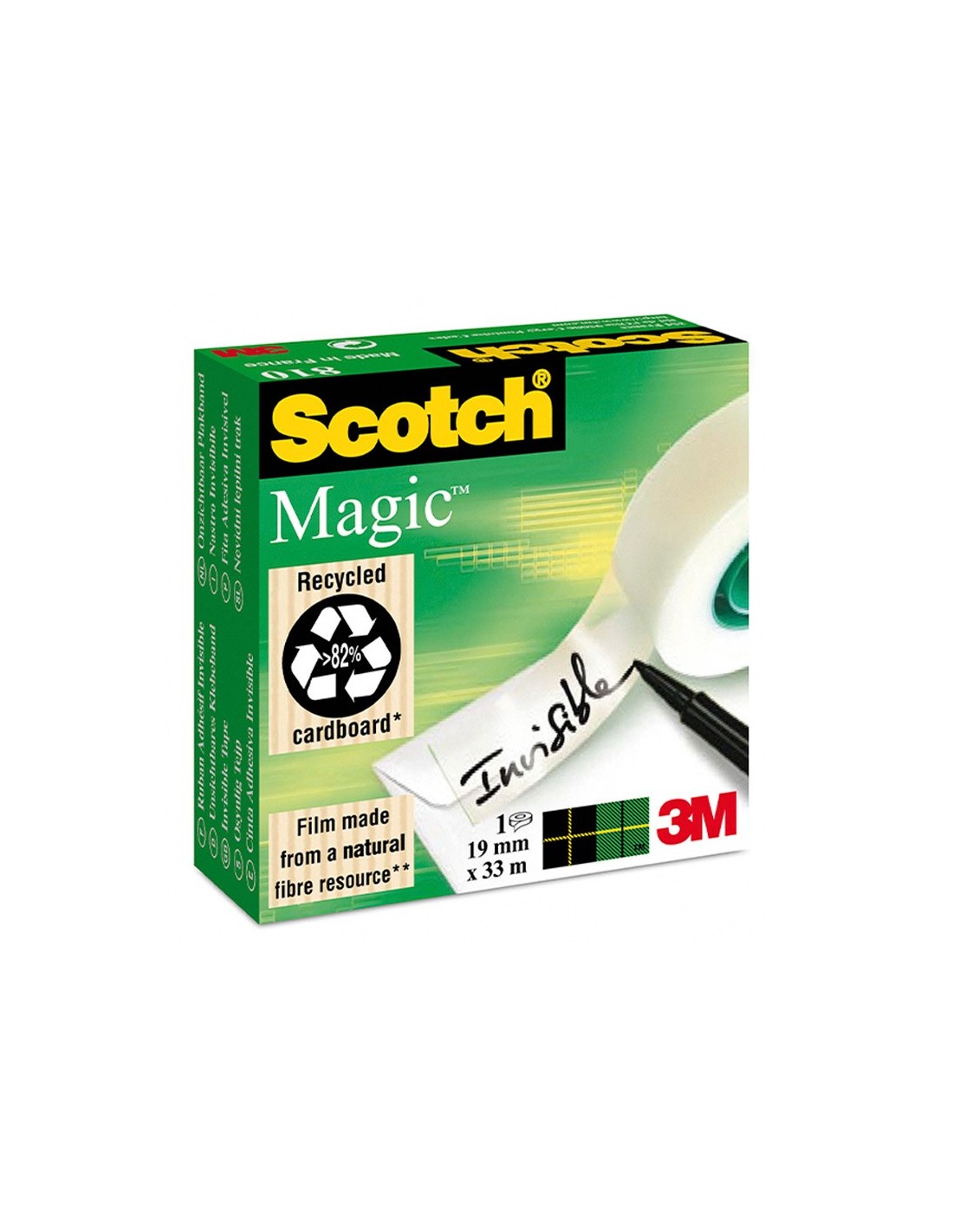Cinta invisible en caja. Invisible tras su aplicación, incluso al fotocopiar. Se puede escribir sobre ella. Fácil de desenrollar, cortar y manejar. Excelente envejecimiento, no amarillea con el paso del tiempo. No se despega y no transfiere el adhesivo.