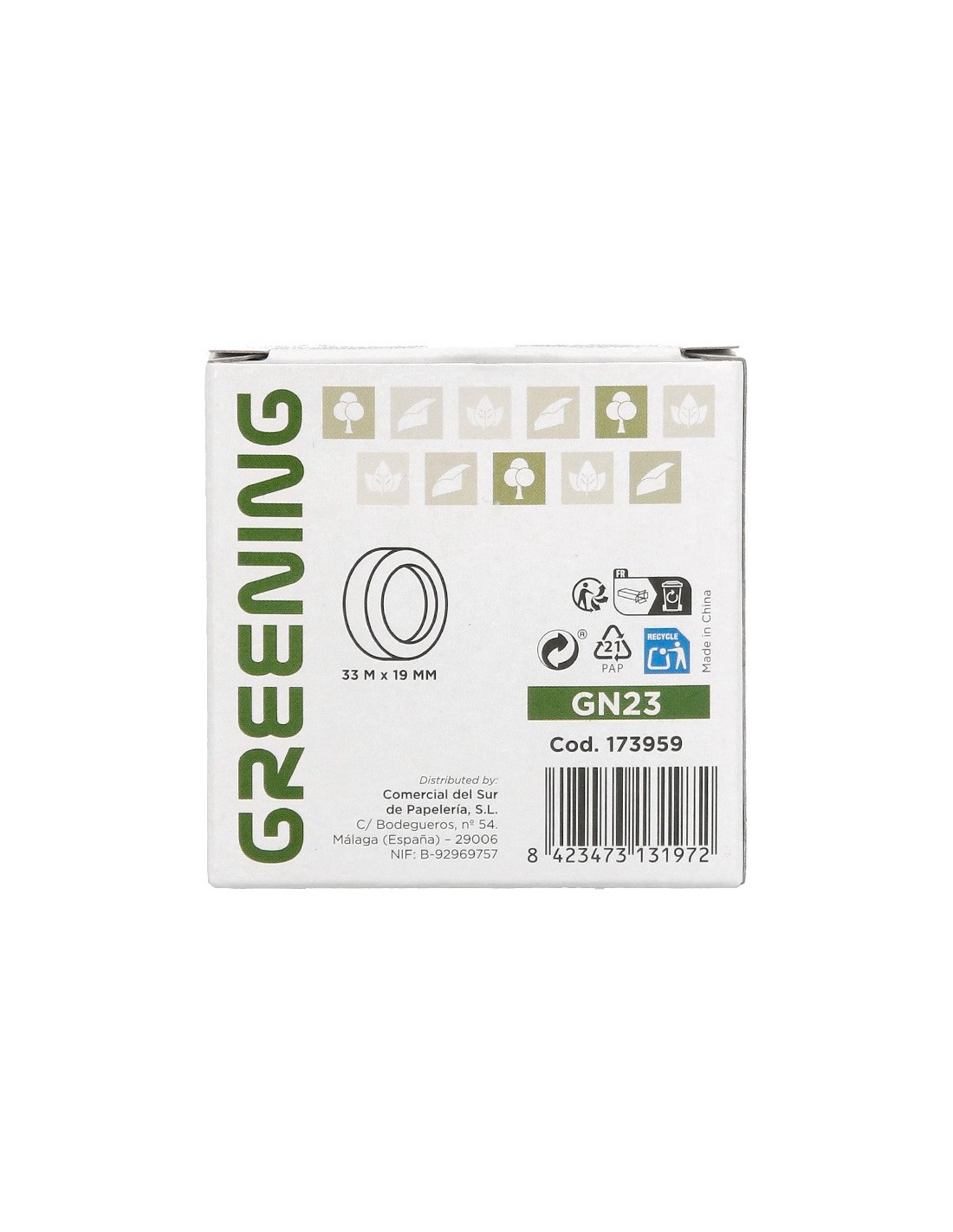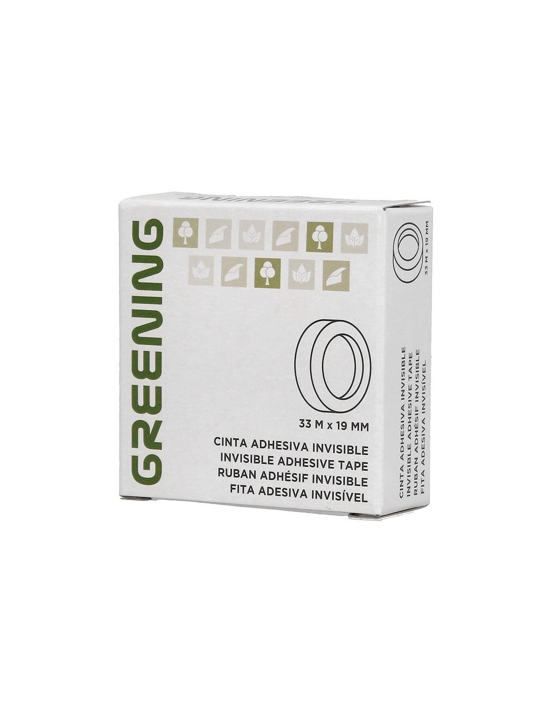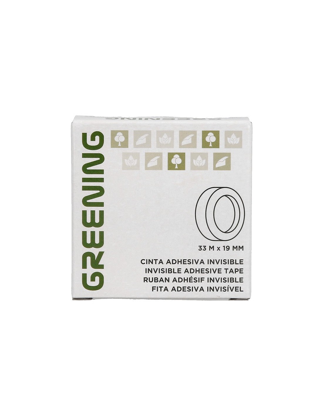 La cinta adhesiva Greening Invisible es una solución ideal para una ampliavariedad de aplicaciones en oficinas, hogares y entornos educativos. Su p rincipal ventaja es su invisibilidad, lo que garantiza un acabado limpio yprofesional. Dimensiones: Longitud: 33 metros, Ancho: 19 milímetros Invis ibilidad: Se vuelve transparente al aplicarla sobre papel, ideal para reparaciones discretas y para pegar documentos sin que las uniones sean visibles. Escritura: Permite la escritura con bolígrafo, lápiz o rotulador, perfecta para etiquetar y tomar notas directamente sobre la cinta. Fácil de cortar: Puede ser cortada fácilmente con las manos o con un dispensador de cinta, facilitando su uso en diversas situaciones. Adhesión y Resistencia: Ofrece una adhesión fuerte y duradera que asegura que los documentos y objetos permanezcan unidos durante largo tiempo. Resistente al envejecimiento, no se amarillea con el tiempo. Aplicaciones: Reparación de documentos, sellado de sobres, envolvimiento de reg