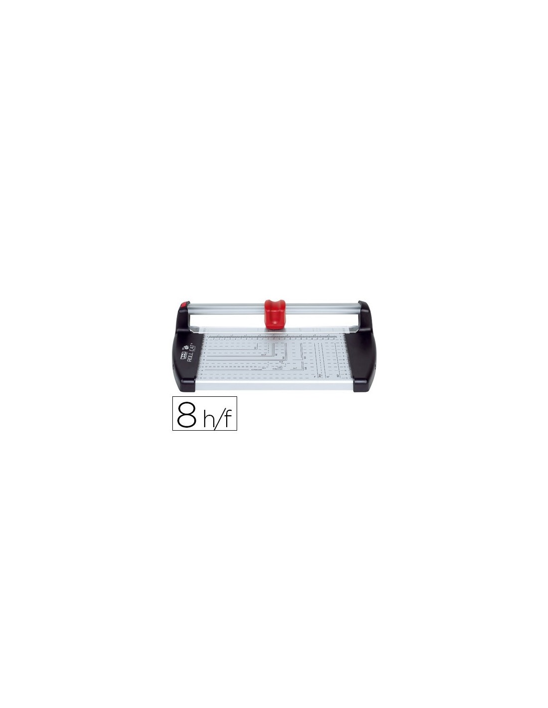 Máquina cortadora con base de aluminio. Robusta y con medidas grabadas en centímetros, pulgadas y resto de formatos habituales. Cuchilla inferior y superior (rodante) en acero templado con cabezal cortante ergonómico. Cabezal de seguridad que protege la cuchilla fácil de cambiar. Precisa y fácil de utilizar. Especialmente indicada para profesionales como diseñadores gráficos, delineantes, fotógrafos, etc. Capacidad de corte: 8 hojas. Disponible en varios tamaños con diversas longitudes de corte.