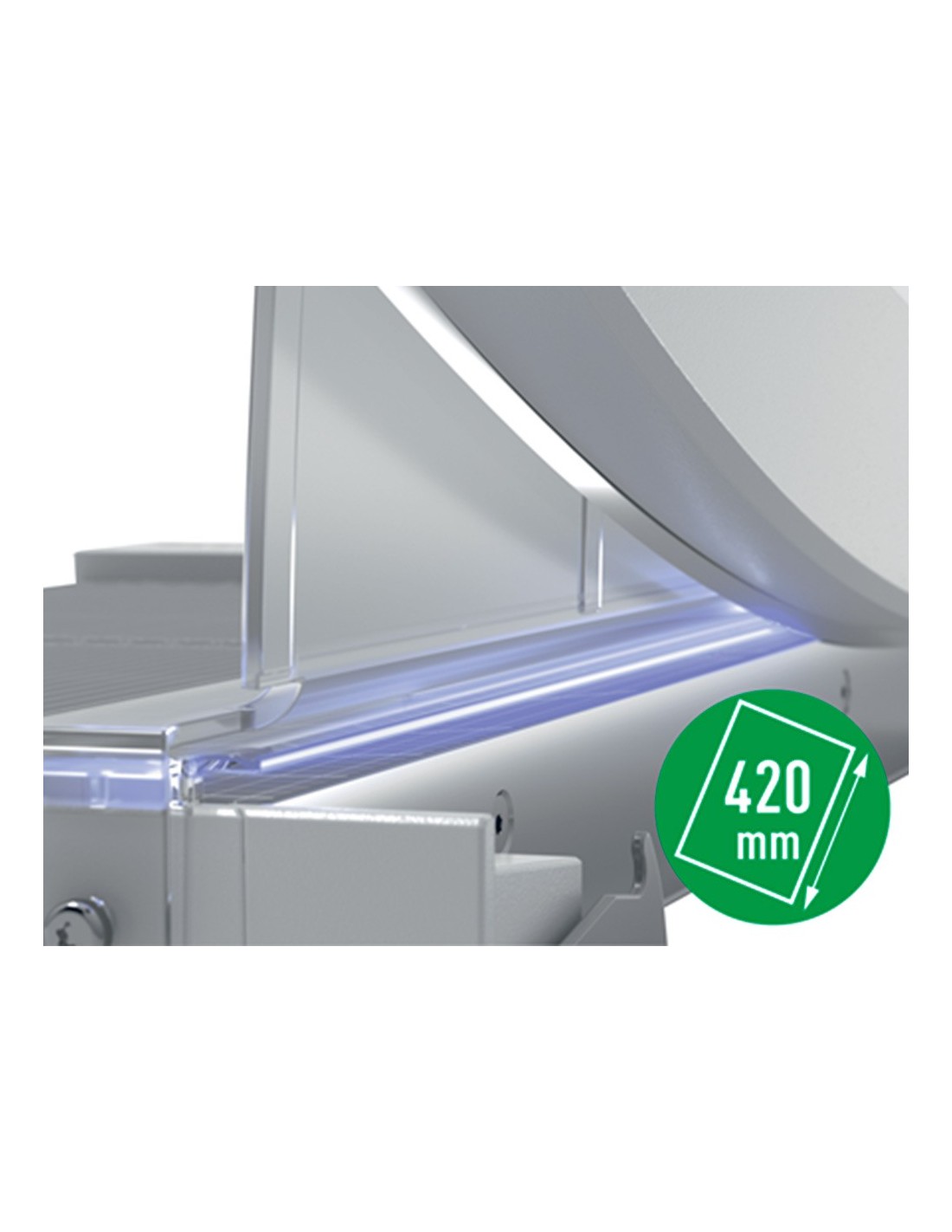 Cortadora de papel doméstica. Capacidad de corte: 10 hojas de papel de 80 g/m². Con tecnología de luz EdgeGlow que ilumina el filo de corte. Con abrazadera de papel manual y transparente y mango ergonómico. Con líneas de la cuadrícula métrica, las guías de ángulos y las reglas de medición en la superficie de trabajo lisa y plastificada. Seguro de la hoja de corte y pestillo de seguridad. Medidas: 470 x 330 x 300 mm. Formato DIN A3. Peso: 2,23 kg.