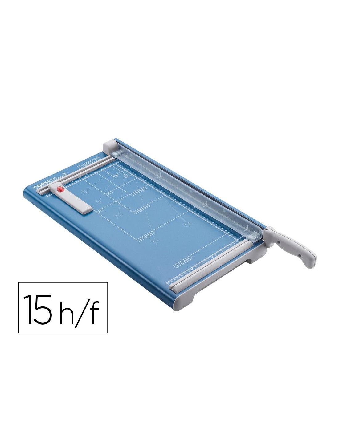 Cizalla compacta con sólida base de metal con esquinas redondeadas y pies de goma antideslizantes para una posición segura. Capacidad de corte de 15 hojas. Líneas de formato con divisiones en mm que facilitan la alineación del objeto a cortar. Mango ergonómico. Dos topes angulares con escala en mm para un corte exacto de 90º. Cuchilla superior de acero atornillada al dorso de la cuchilla de acero macizo. Tope posterior regulable para la detección rápida del formato. Longitud de corte 460 mm. Medidas: 569 x 285 mm.