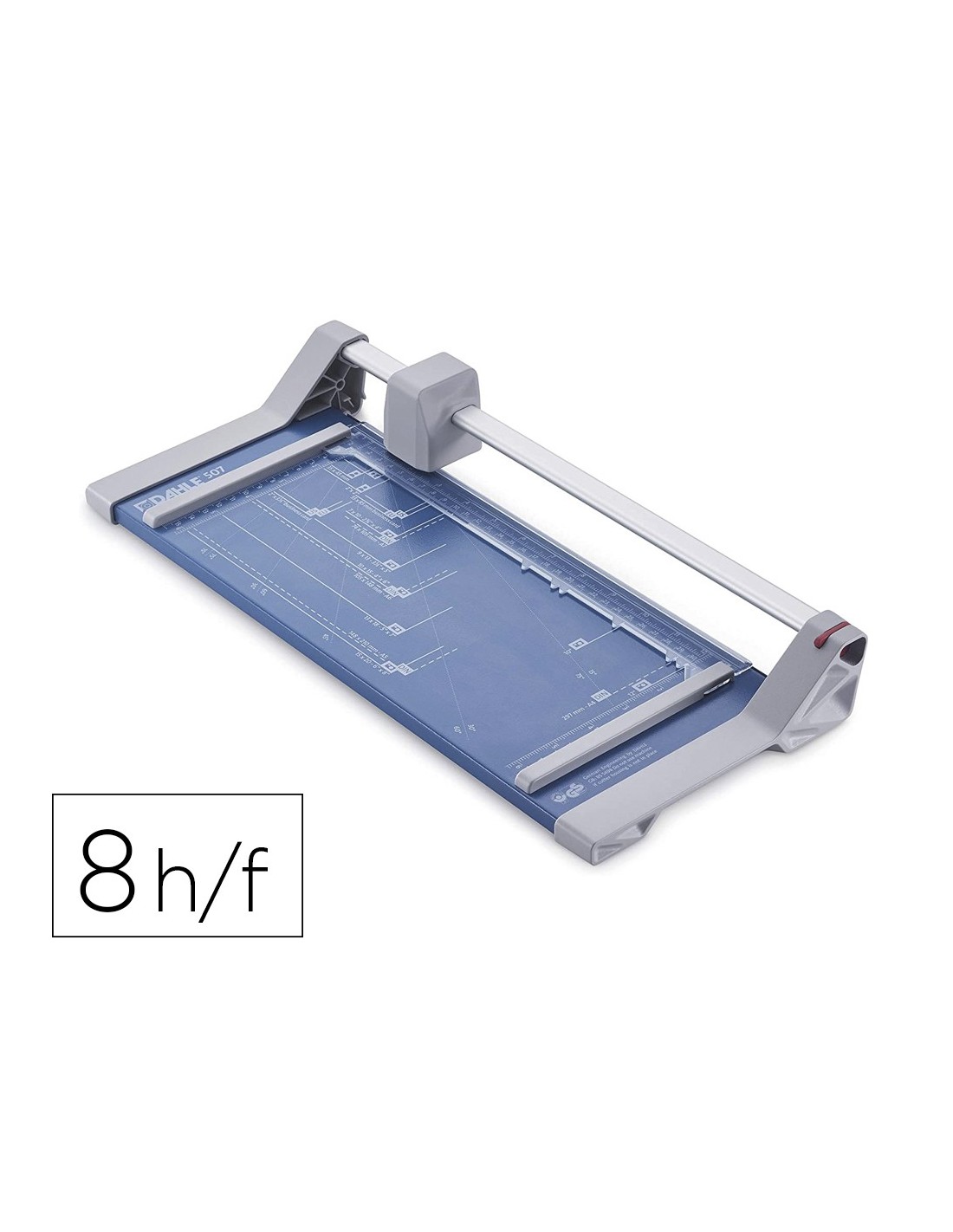 Cizalla de rodillo compacta para uso doméstico. Las útiles líneas de formato con divisiones en mm a lo largo del borde de corte de la mesa facilitan la alineación del objeto a cortar. Cuchilla inferior de acero. Dos topes angulares con escala en mm para un corte exacto de 90º. Sólida mesa de metal con patas de goma antideslizantes para un firme apoyo. Cuchilla circular autoafilable de acero, rectificada en el cabezal de corte de seguridad cerrado. Raíl de prensado con marcas de ayuda. Presión automática sobre el lugar de corte para una rápida fijación del objeto a cortar.