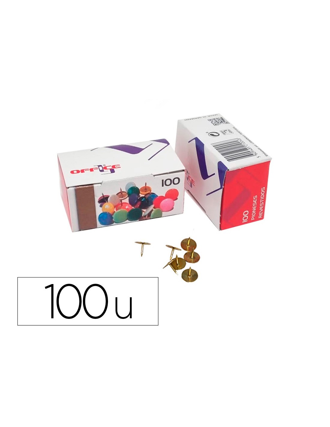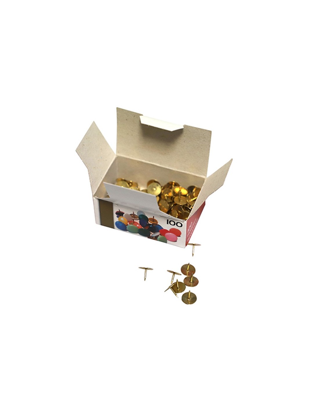 Chinchetas de latón de cabeza plana. Diámetro de la cabeza: 9 mm. Longitud8 mm. Color dorado. Caja de 100 unidades.