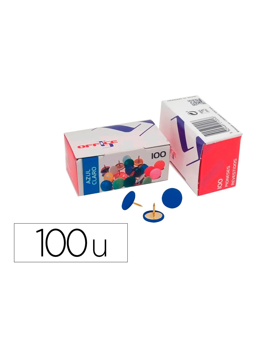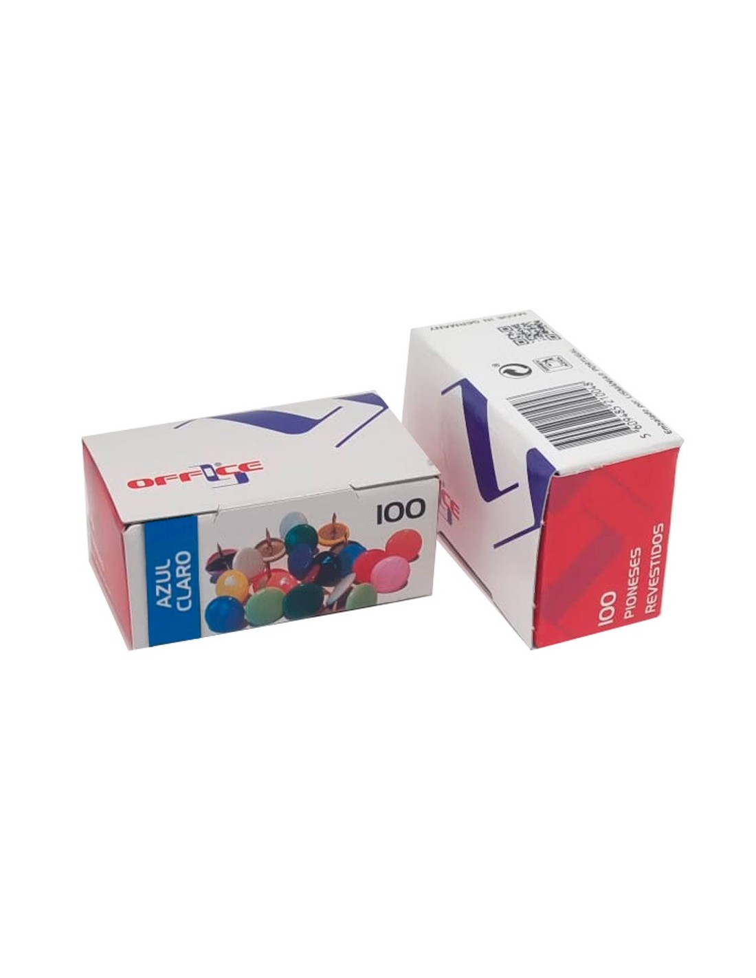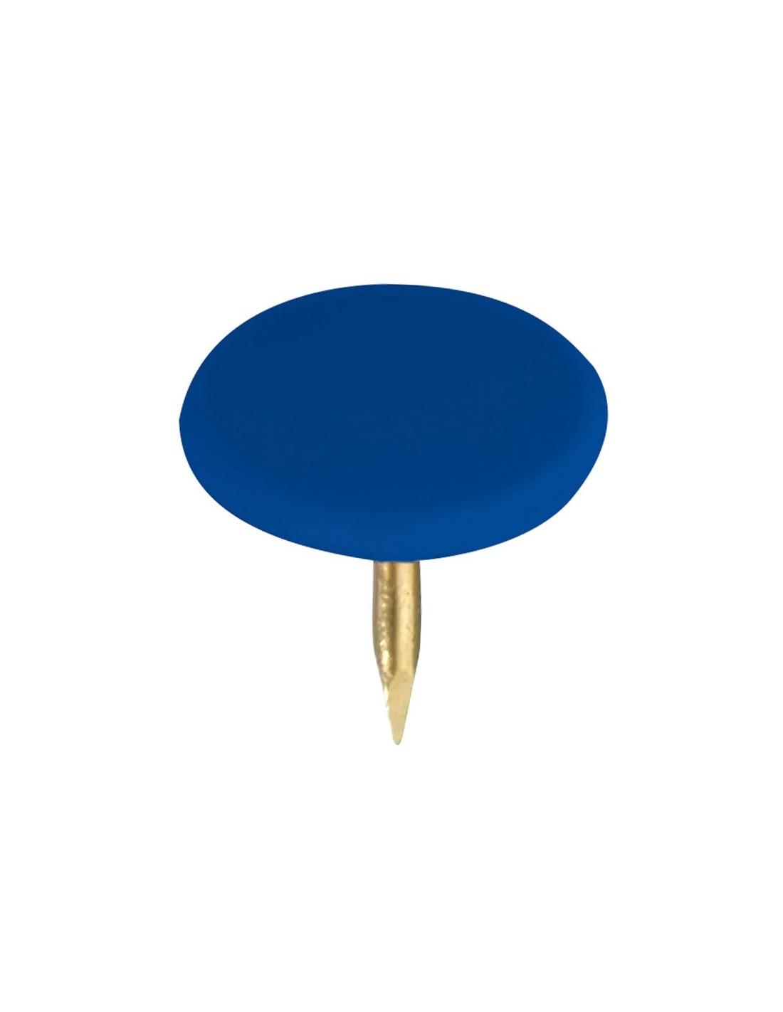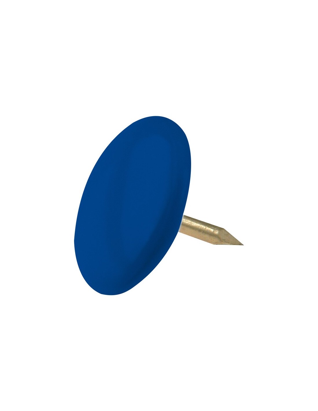 Chinchetas recubiertas de plástico con cabeza plana. Diámetro de la cabeza: 9 mm. Longitud 8 mm. Color azul claro. Caja de 100 unidades.