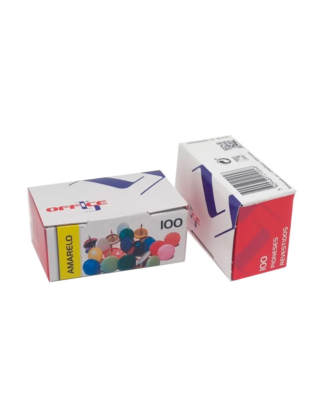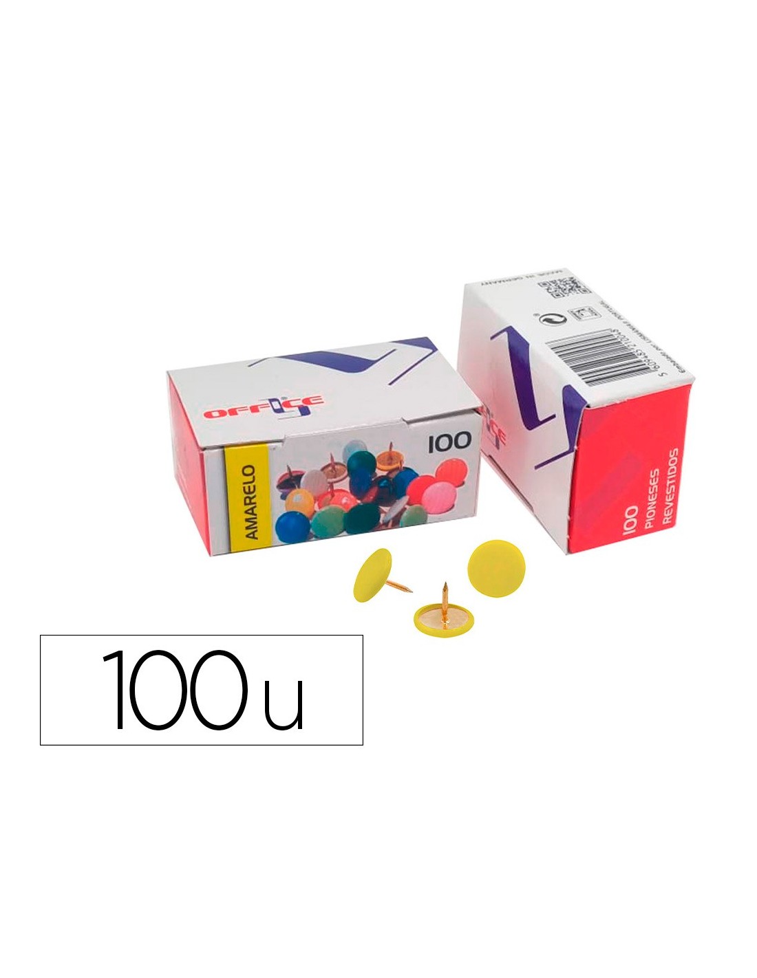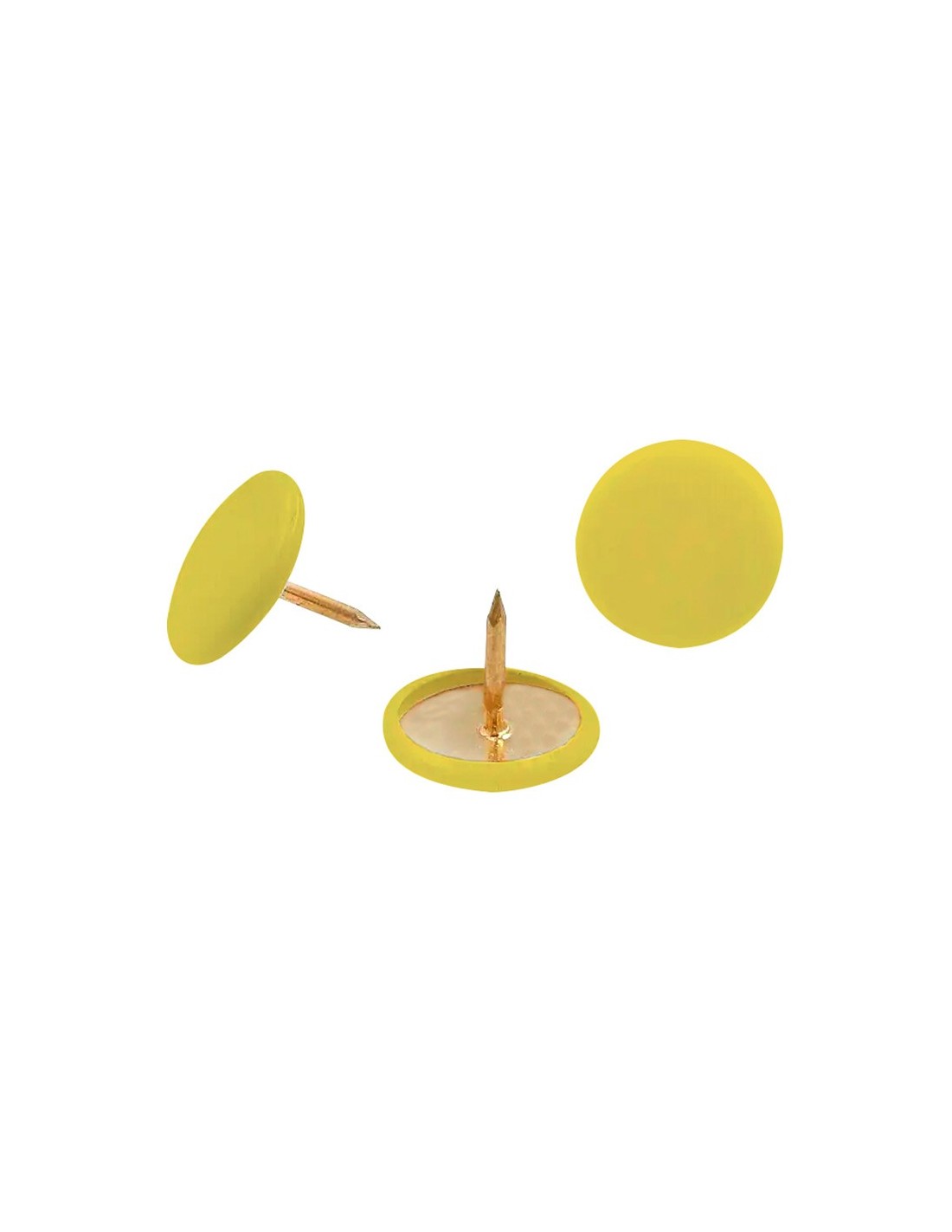 Chinchetas recubiertas de plástico con cabeza plana. Diámetro de la cabeza: 9 mm. Longitud 8 mm. Color amarillo. Caja de 100 unidades.