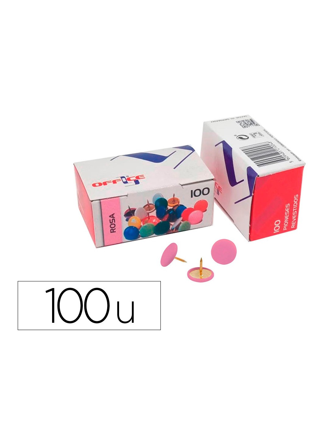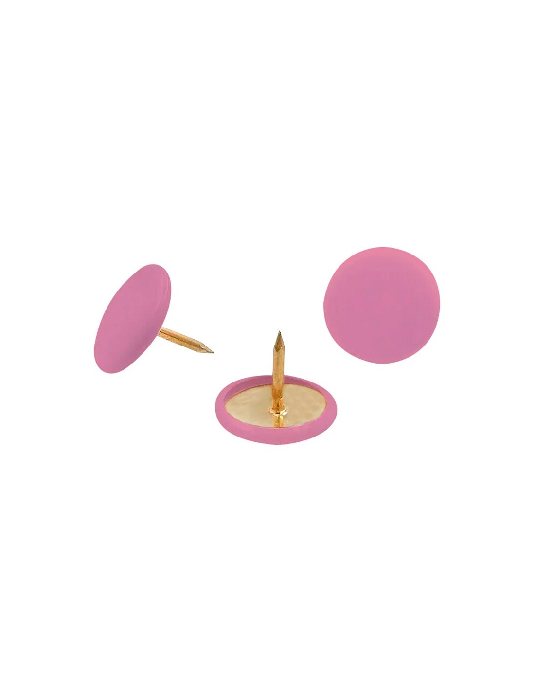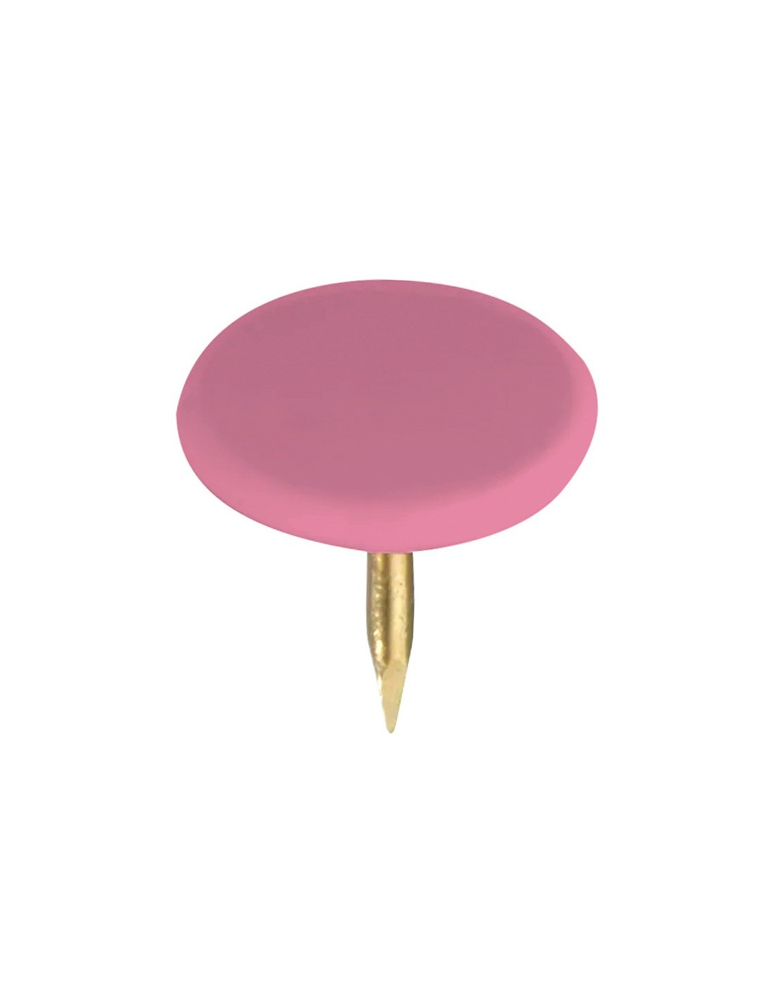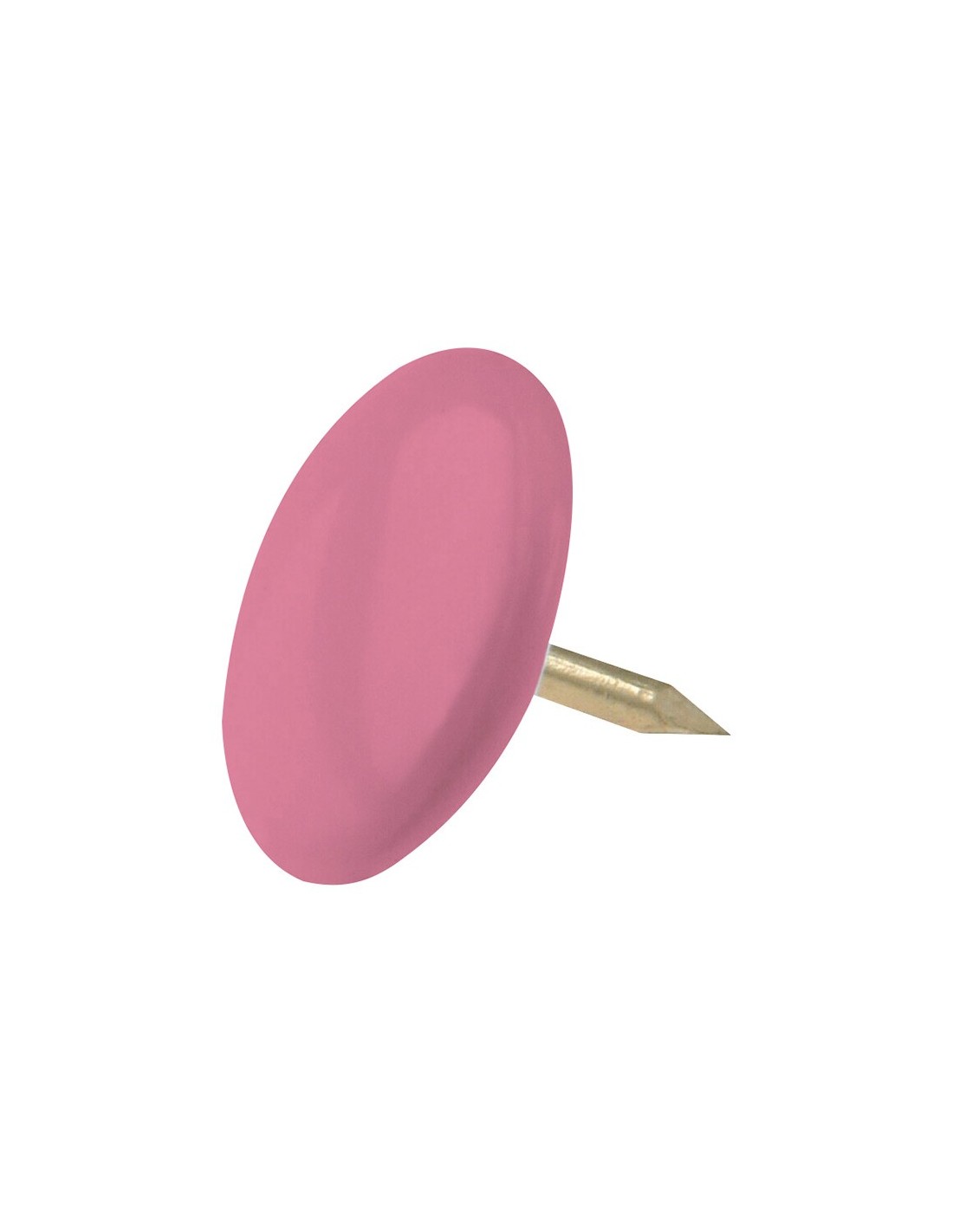 Chinchetas recubiertas de plástico con cabeza plana. Diámetro de la cabeza: 9 mm. Longitud 8 mm. Color rosa. Caja de 100 unidades.