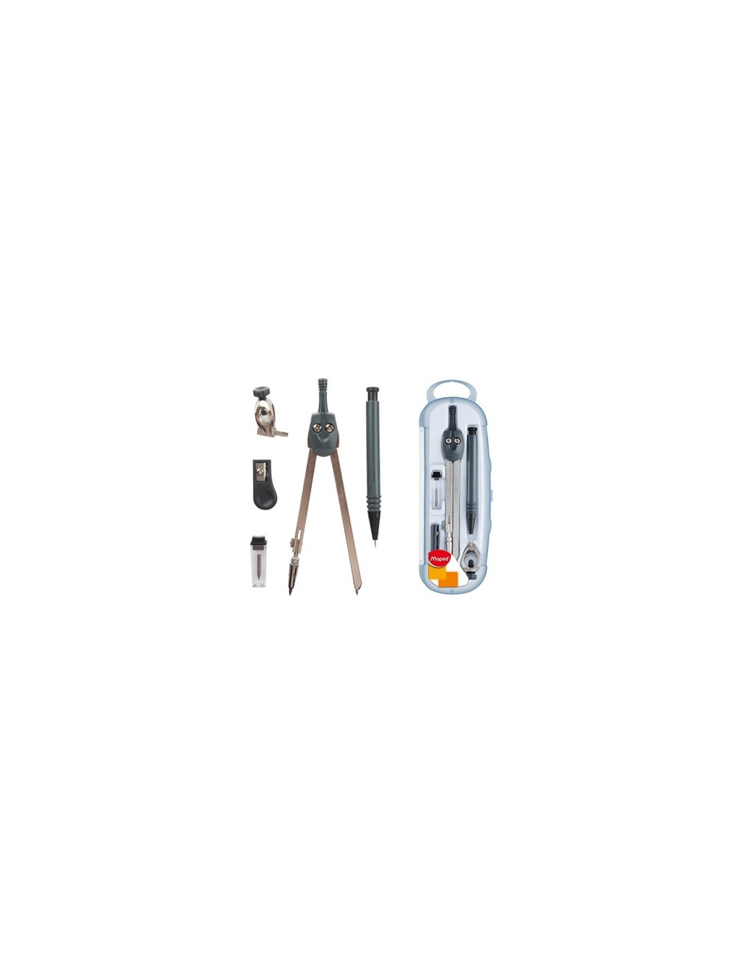 Estuche compás Focus 5 piezas. Varillas de metal. Contenido: 1 compás, 1 adaptador universal, 1 portaminas 0,5 mm, 1 afilaminas y 1 tubo de minas. Longitud: 13 cm. Circunferencia: 37 cm.