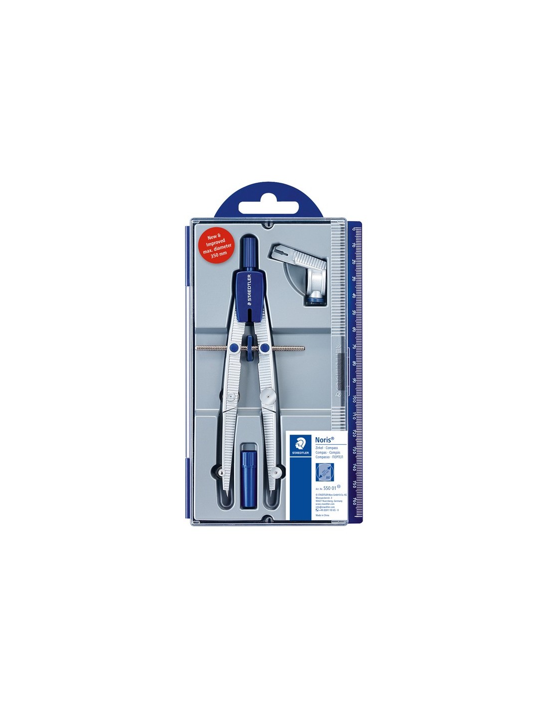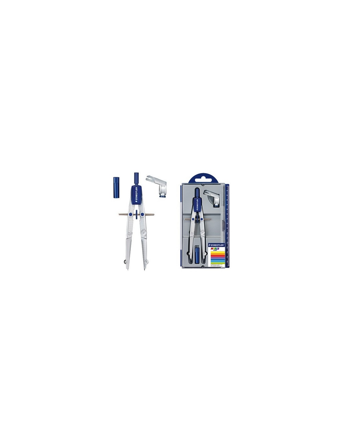 Estuche con compás, tubo de minas, adaptador universal y bigotera. Articulado en los dos brazos. Longitud: 12,4 cm. Con regla de 17 cm. Circunferencia: 30 cm.