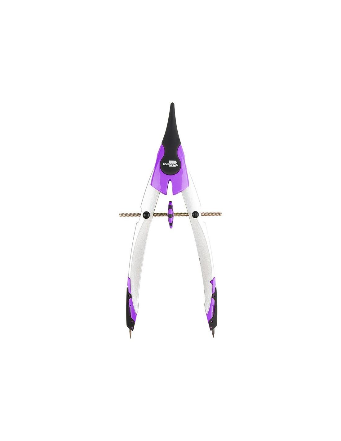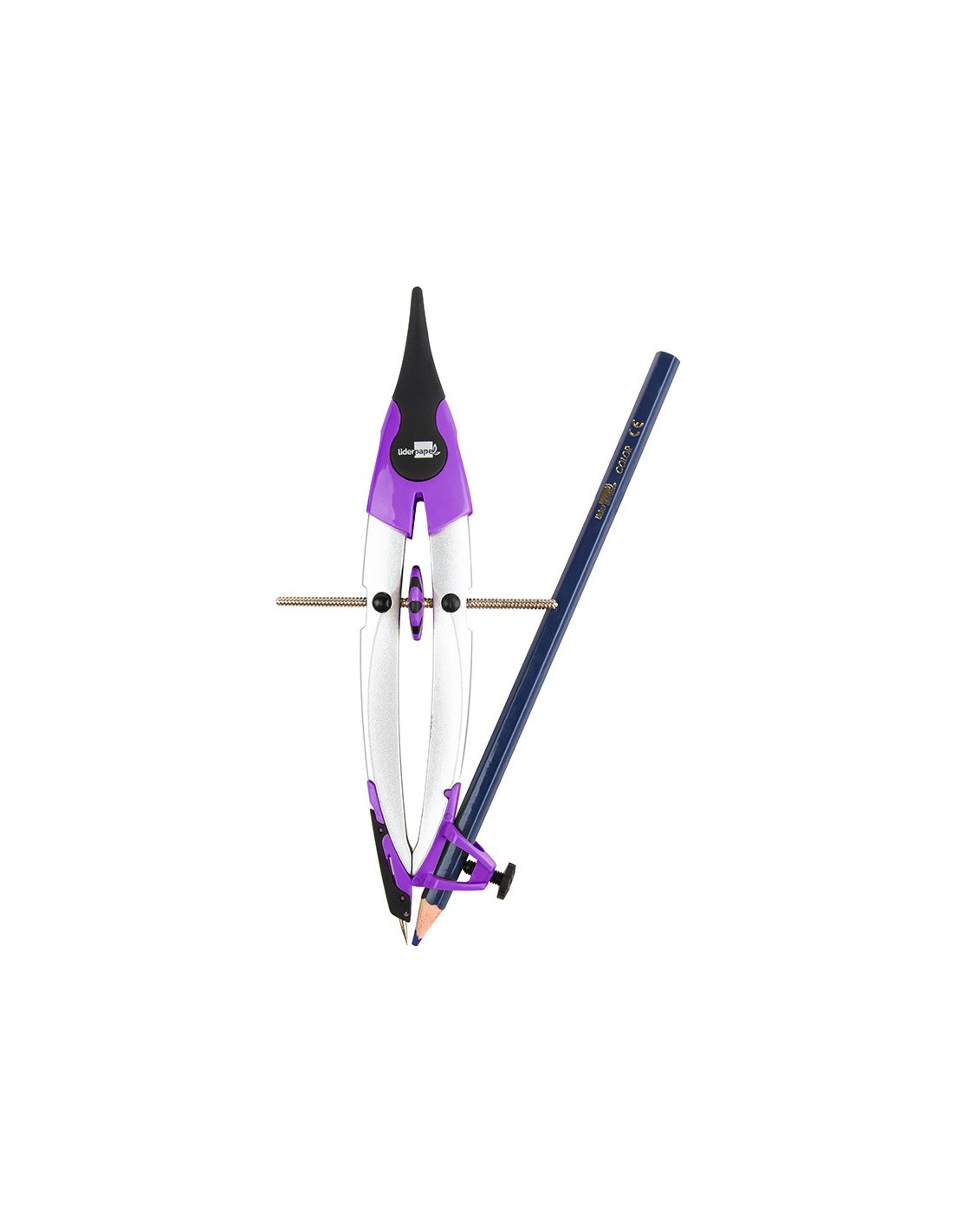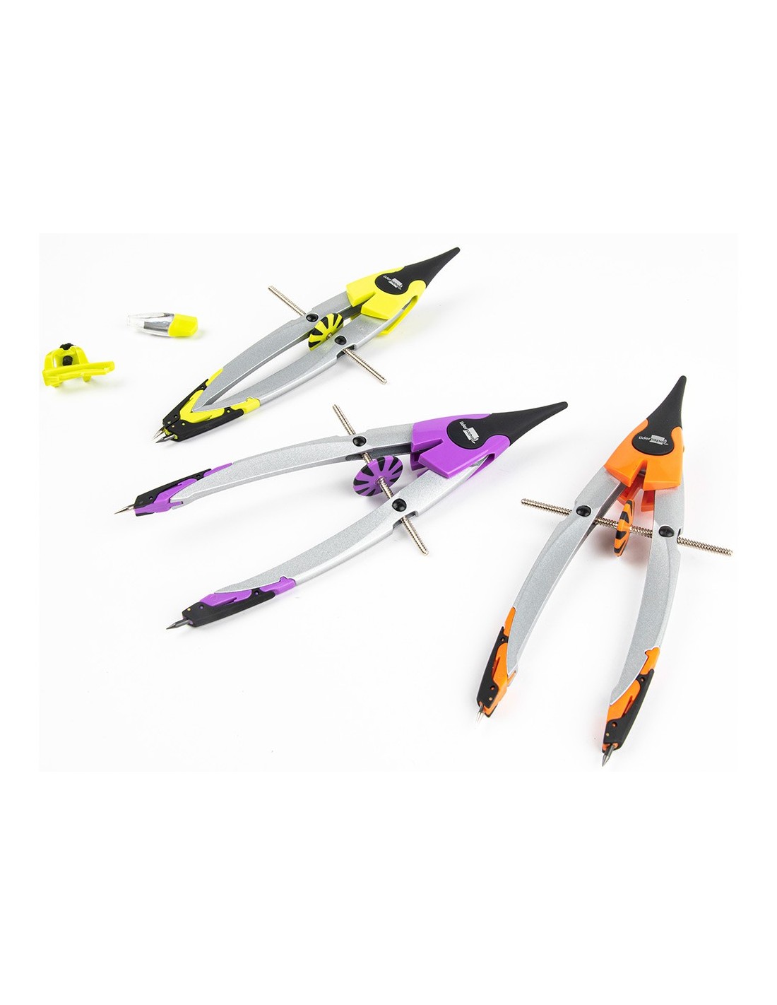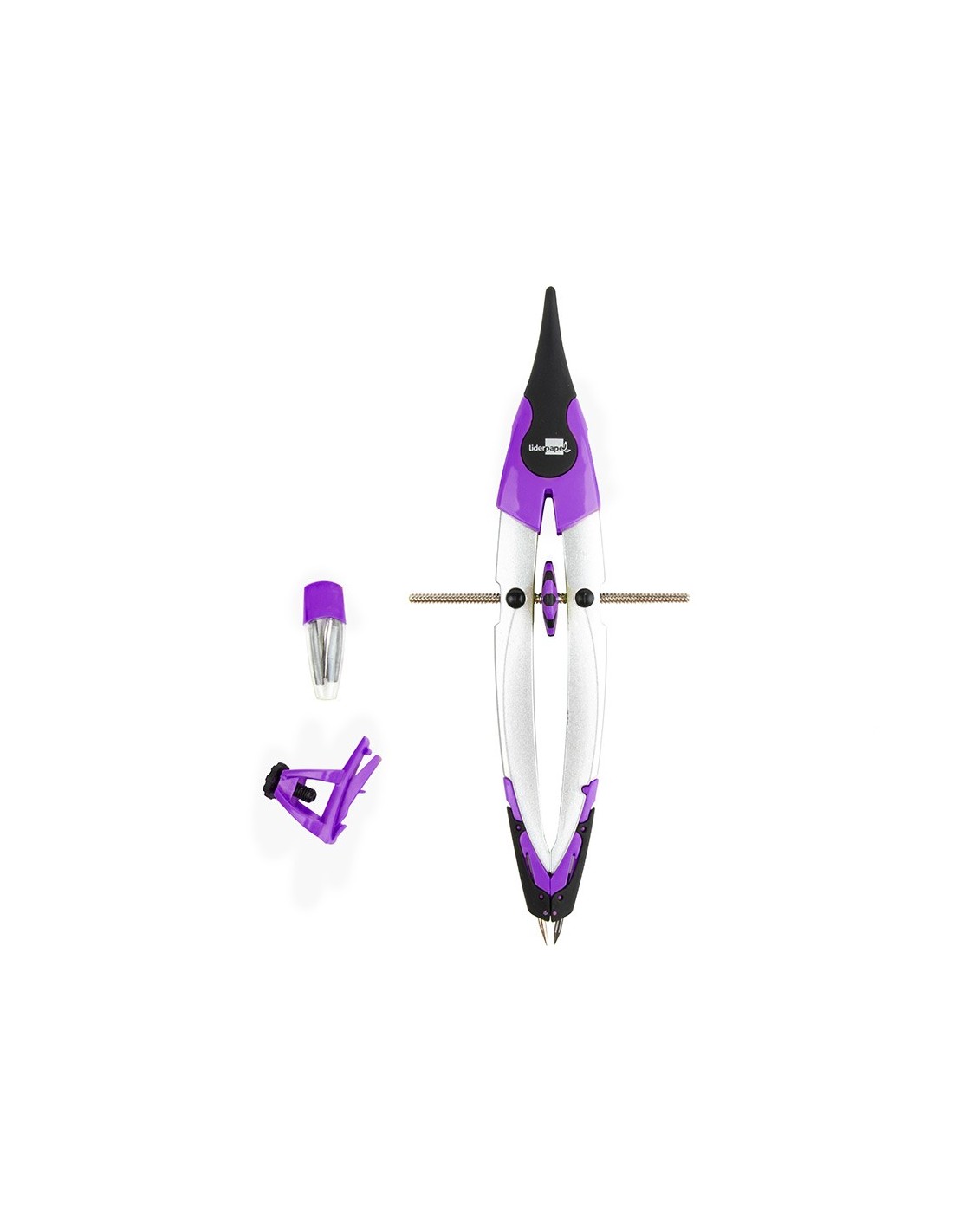 Compás micrométrico con bigotera. Estuche de 2 minas de 2 mm y adaptador universal. Colores surtidos: lima, morado y naranja. Longitud: 18 cm. Circunferencia: 36 cm.