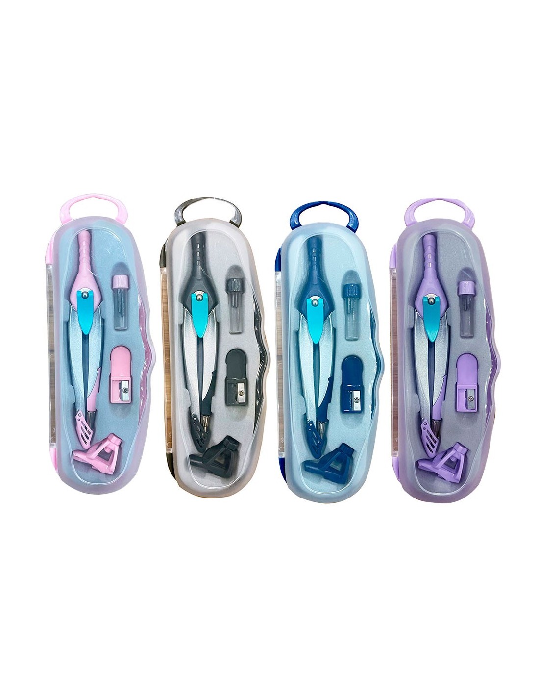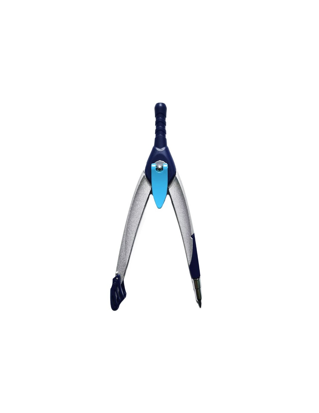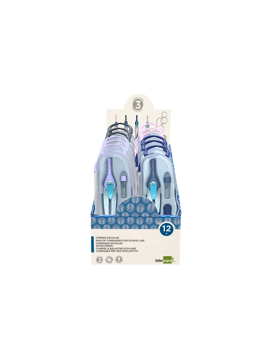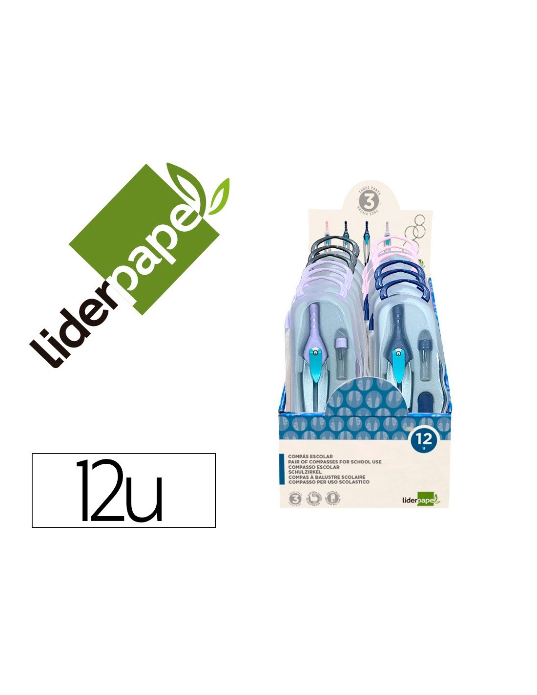 Compás con sistema de bloqueo de los brazos para trazar los círculos. Contiene abrazadera universal y tubo de minas. Con protector de punta. Atractivo expositor sobremesa con 12 unidades en colores surtidos.