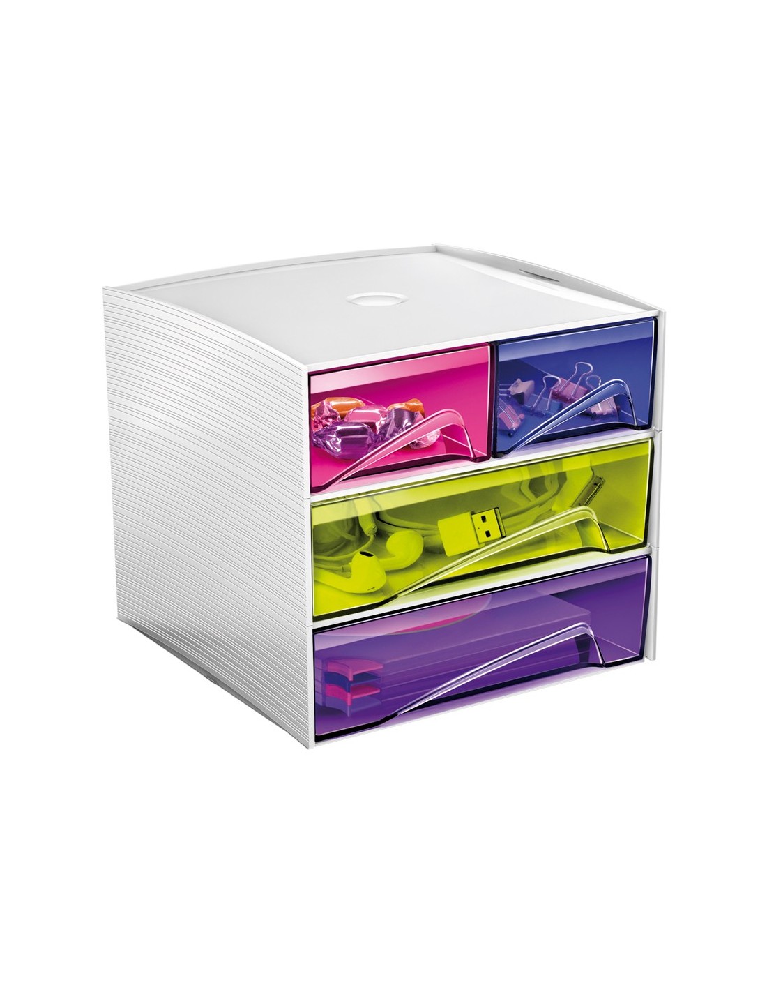 Módulo de cajones apilables fabricado en poliestireno 100% reciclable. Apilable. Su ingenioso y compacto diseño, lo hace ideal para almacenar y recoger pequeños accesorios y material de oficina. Los cajones están equipados con topes de retención y mangos ergonómicos. Con almohadillas antideslizantes incluidas. 4 cajones. Multicolor. Medidas: 186 x 185 x 175 mm. No incluye accesorios.