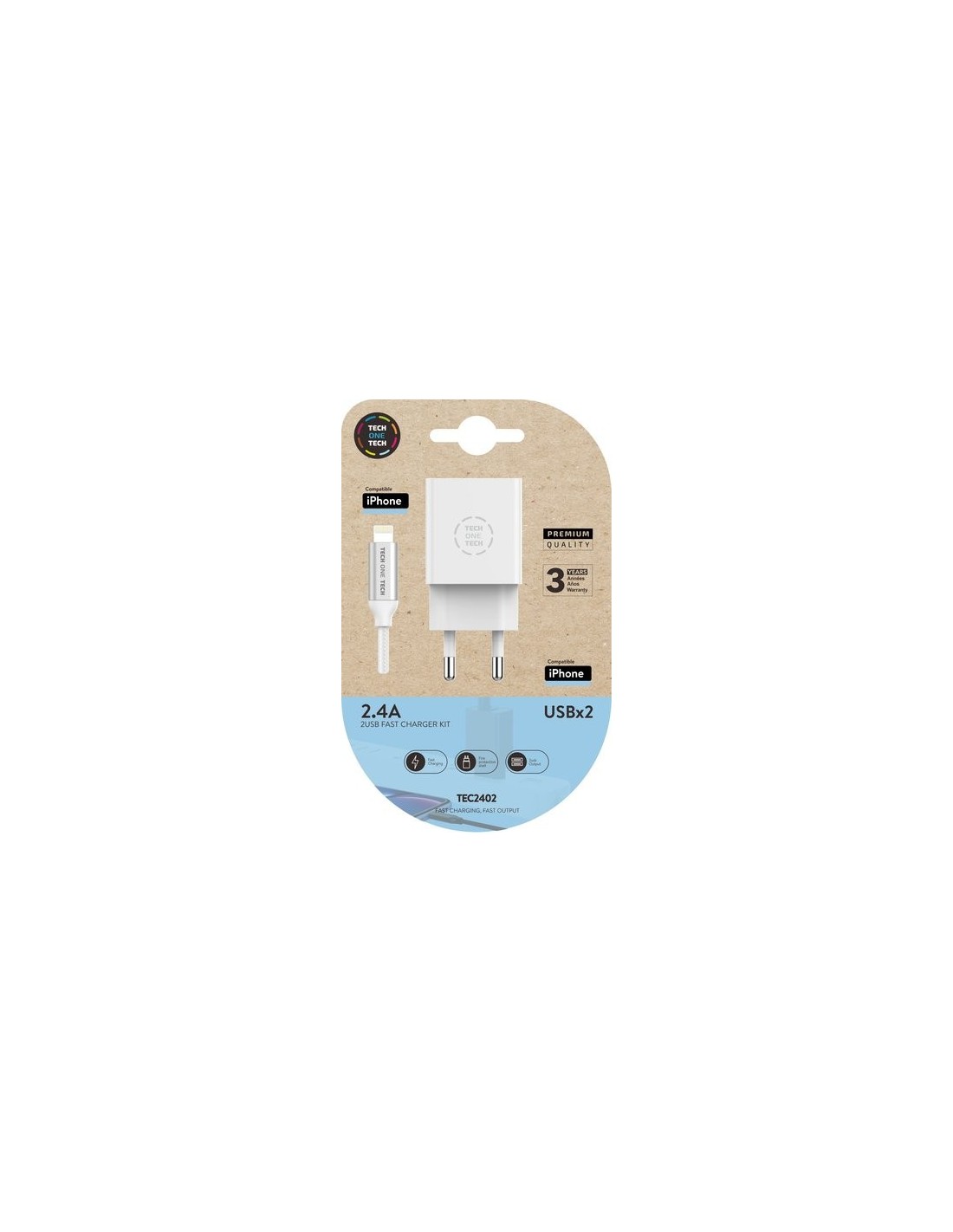 CARGADOR TECH ONE 2.4 2XUSB+CABLE BRAIDED MICRO USB APPLE 1MT.BL.