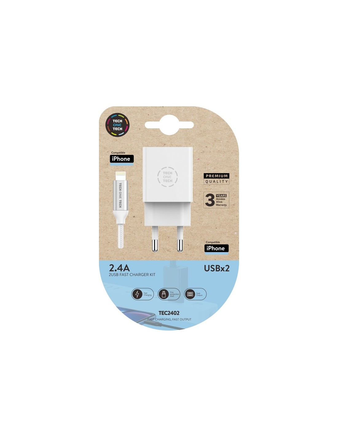 CARGADOR TECH ONE 2.4 2XUSB+CABLE BRAIDED MICRO USB APPLE 1MT.BL.