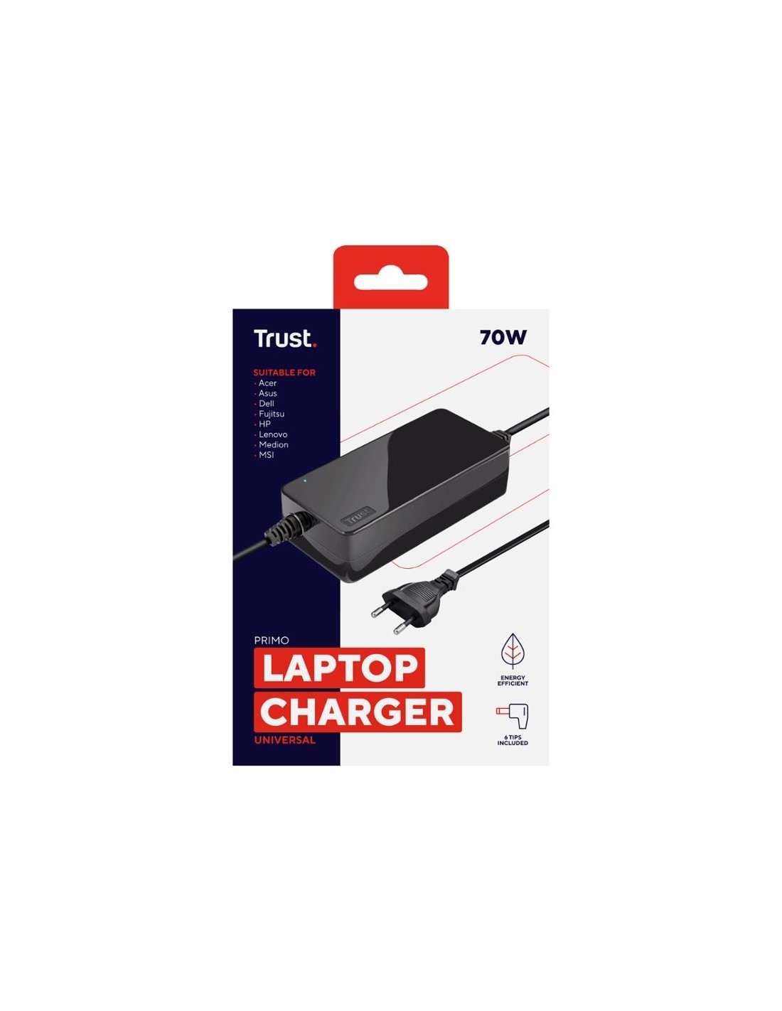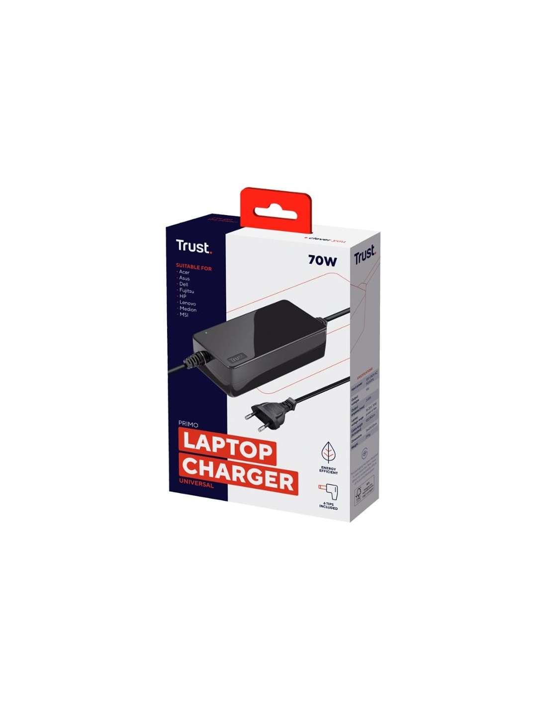 Cargador universal para ordenador portátil de 70 W. Puede utilizarse con ordenadores portátiles de las marcas Acer, Asus, Compaq*, Dell, Fujitsu, HP, Lenovo, Medion, MSI, Packard Bell* y Samsung*. Conectores incluidos para la mayoría de las marcas de portátiles más populares, servicio gratuito de conectores para compatibilidad total. Sistema de protección inteligente para garantizar una carga rápida y segura. Ideal para viajar: tiene un diseño compacto y funciona a 100-240 V 50/60 Hz. Diseño de consumo eficiente de energía, fiable y duradero. Compatible con portátiles que requieren como mínimo 18-20 V y 70 W. Color negro. Medidas 38 x 48 x 112 mm. Longitud del cable: 120 cm. Peso: 313 g.