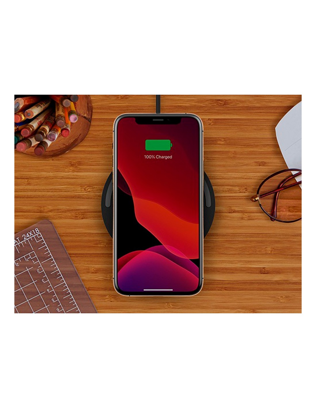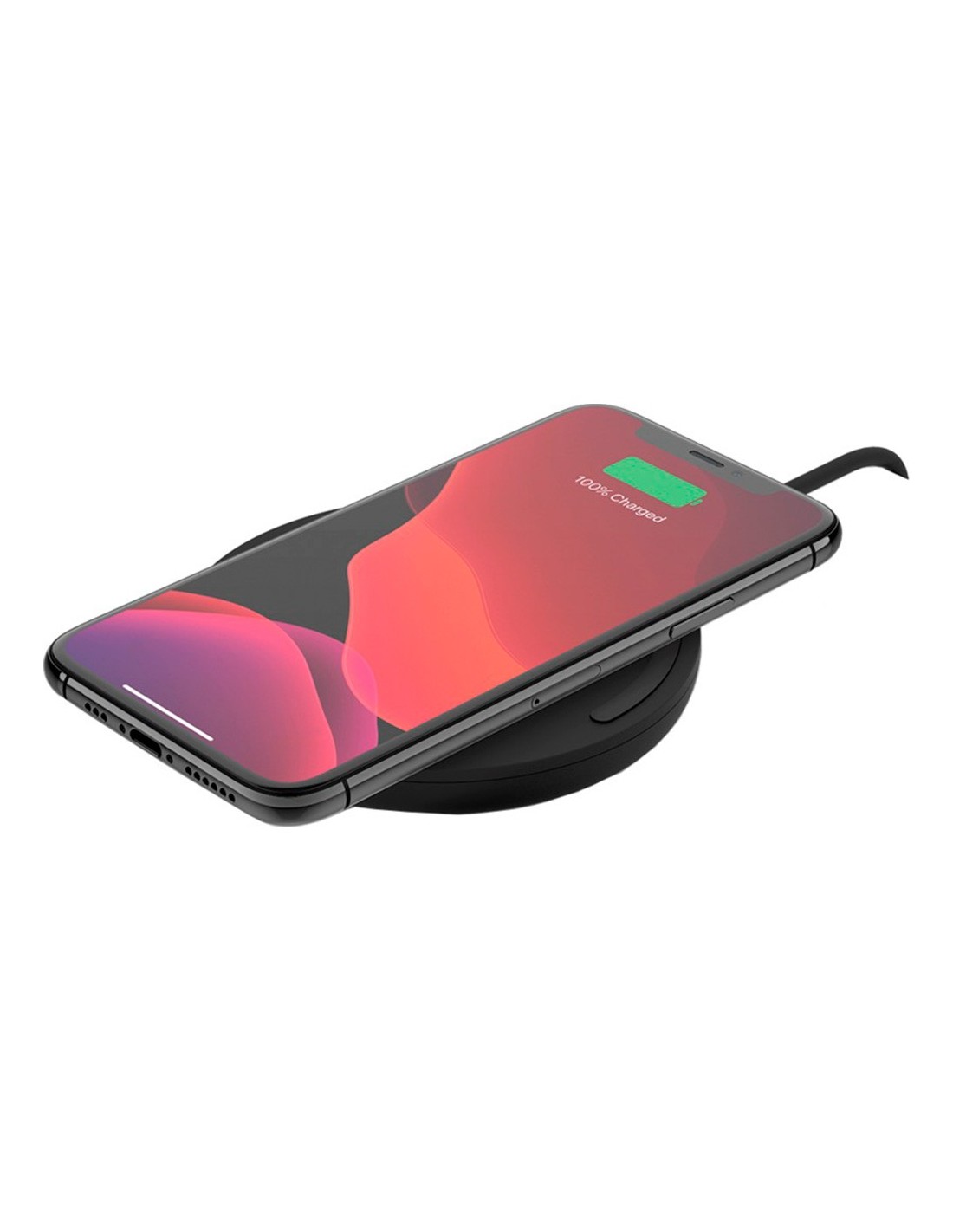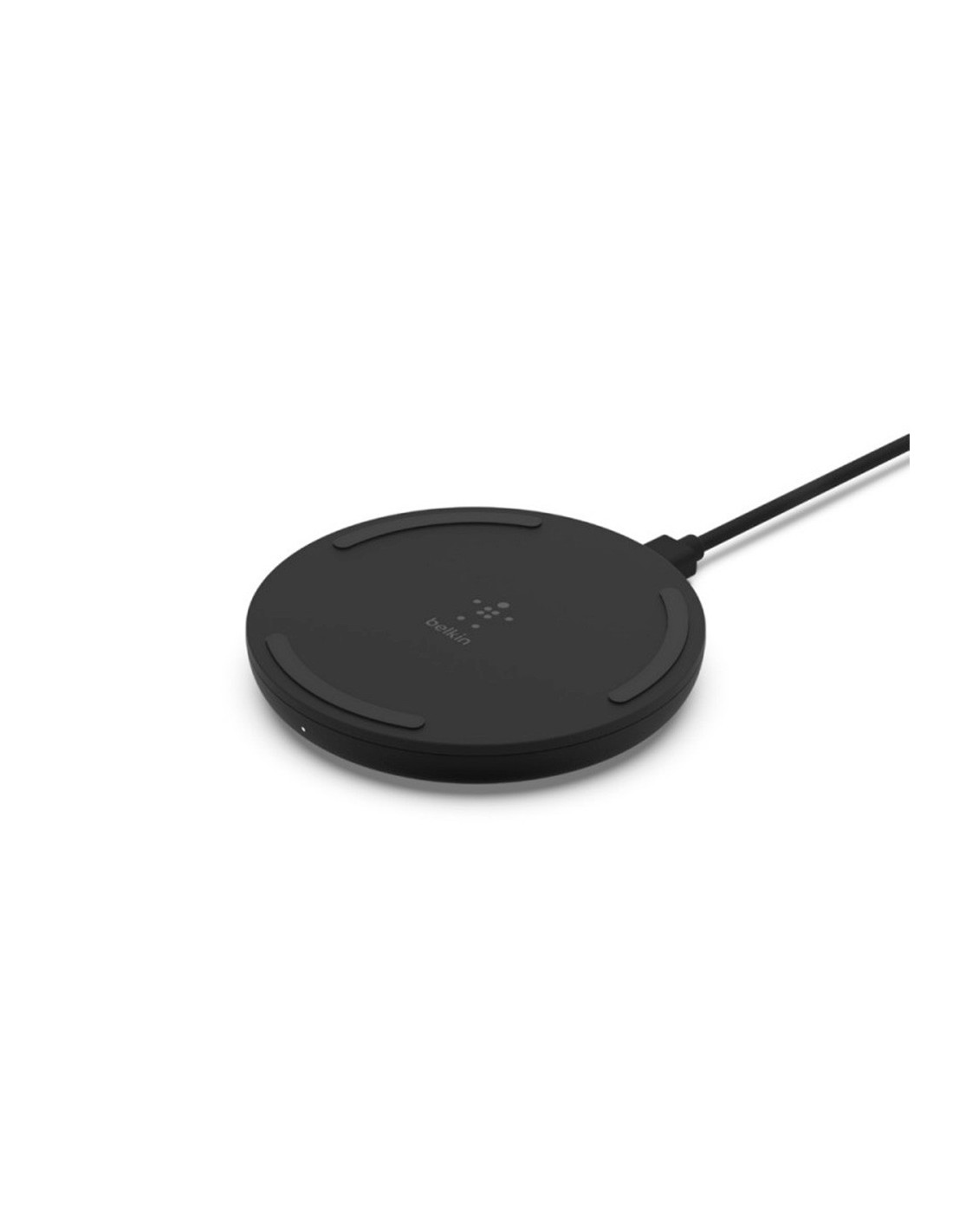 Carga rápida inalámbrica de hasta 10 vatios. Tan sencillo como colocar el teléfono sobre la base para cargarlo rápida y fácilmente. Ha sido diseñada para suministrar 5 vatios para cualquier otro dispositivo habilitado con Qi a la vez que carga. Carga sin quitar la funda. Una luz LED blanca que indica si el teléfono está bien alineado y cargándose correctamente. A su vez, una luz de color ámbar alerta de la presencia de un objeto extraño sobre el cargador. Cargador de pared y cable incluidos. Se pueden conectar otros dispositivos compatibles con Quick Charge al cargador de pared usando el cable incluido para cargar de 0 a 80 % en tan solo 35 minutos. Medidas: Ø 90 mm x 13,3 mm. Peso: 74 g.