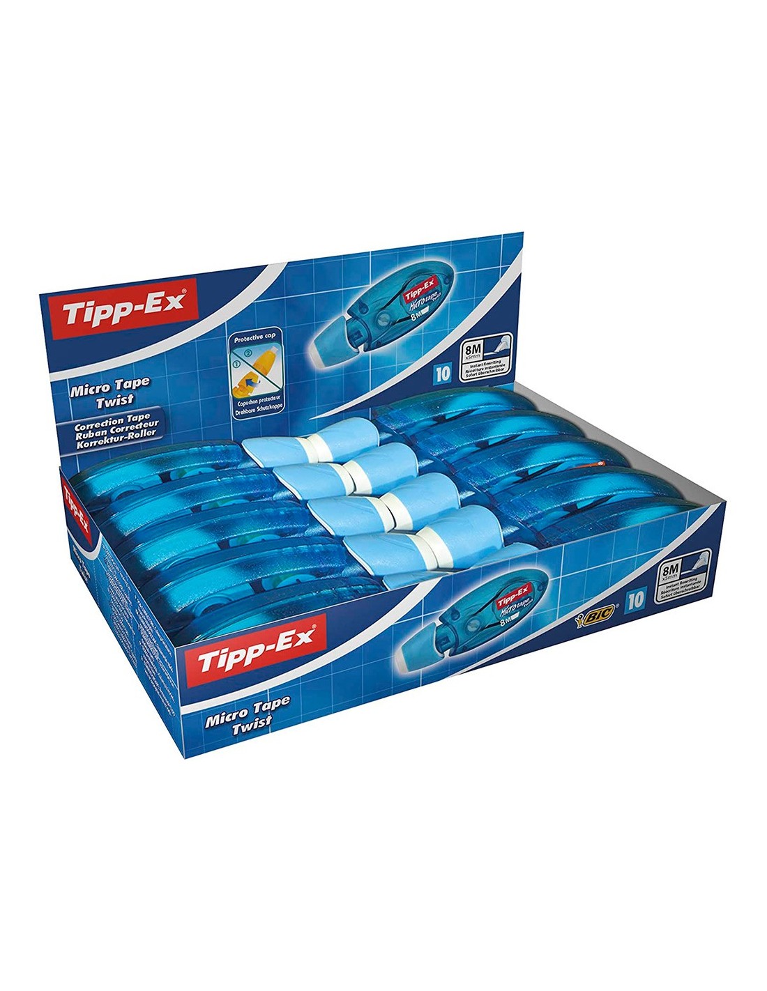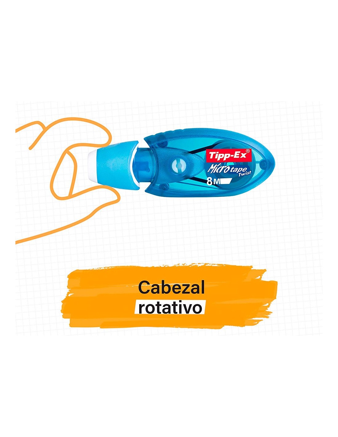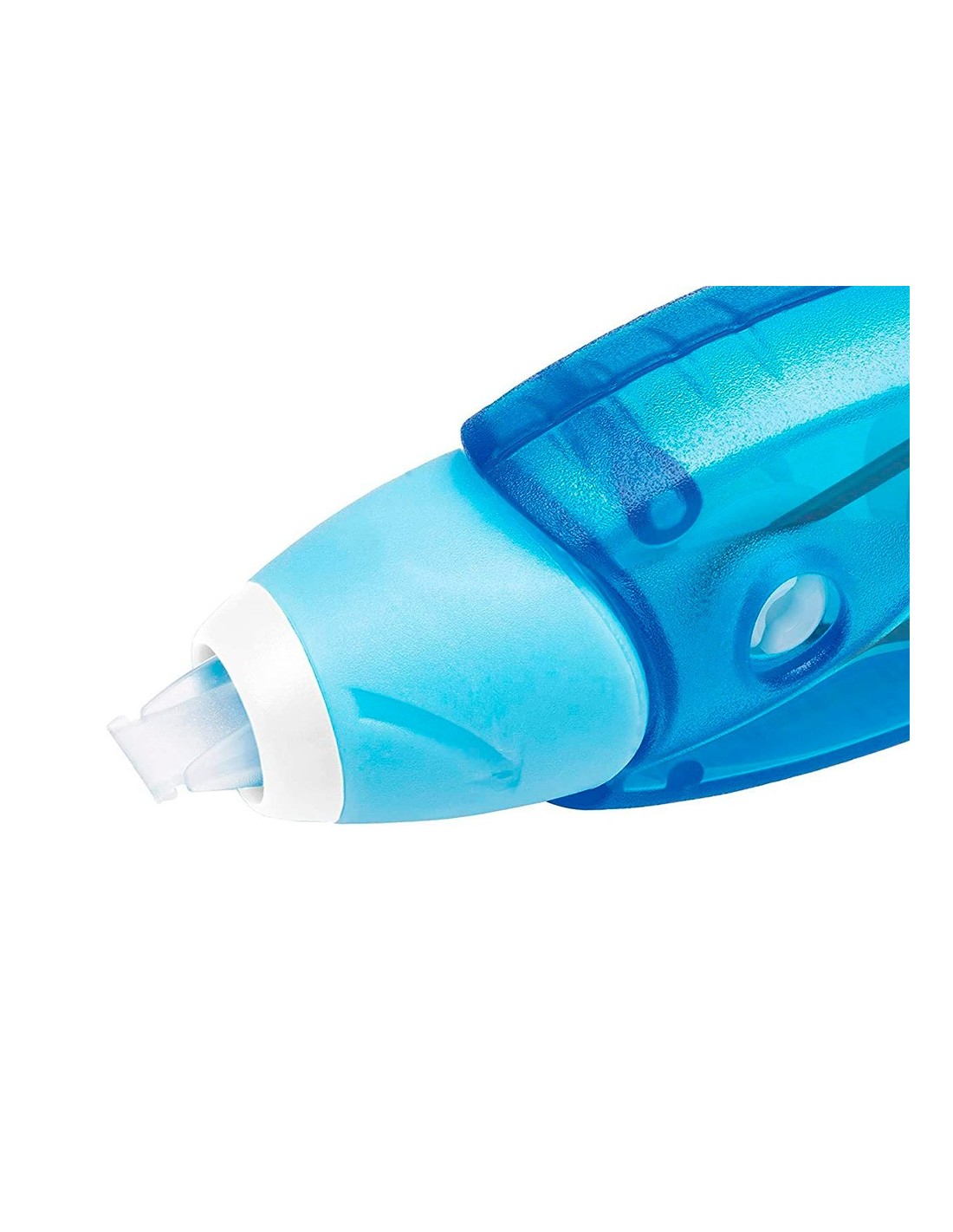 Cabezal rotativo patentado para proteger la punta. Supercompacto, no ocupa espacio. Diseño moderno con nuevos colores divertidos. Ancho de la cinta: 5 mm. Largo: 8 m.