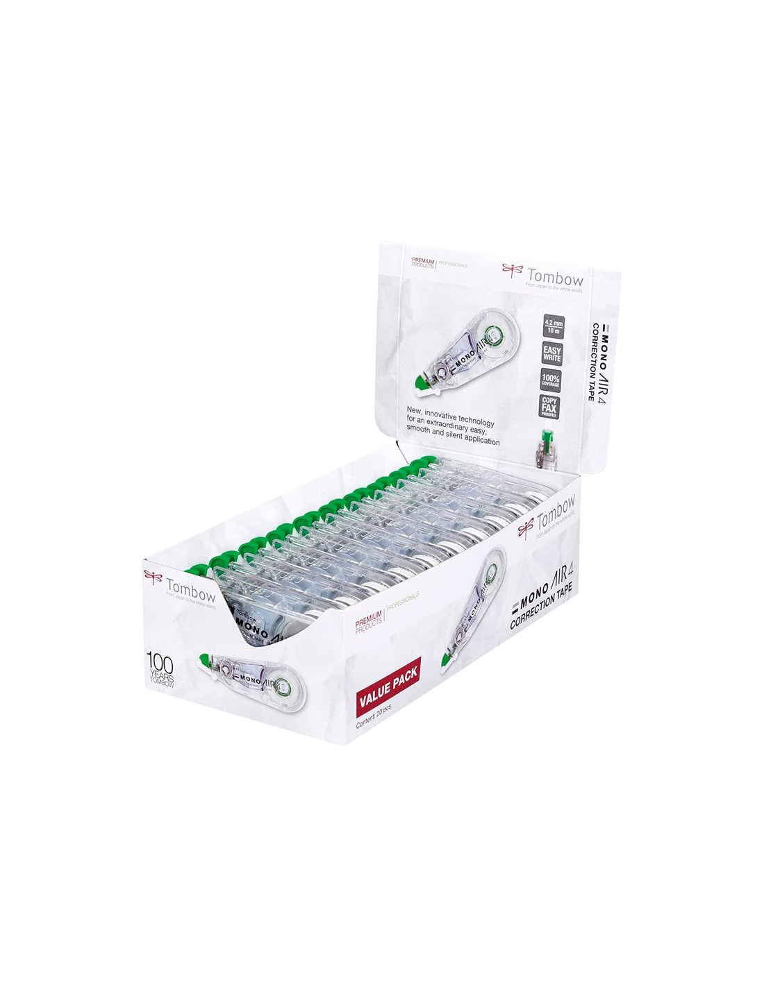 Corrector ligero y compacto, con enorme poder cubriente. Aplicación frontal. Corrige como si escribiera. Con un cómodo y sencillo sistema para controlar el suministro de la cinta. Se puede escribir inmediatamente tras su aplicación. Funcionamiento ultra-silencioso, ideal para su uso en las aulasy bibliotecas. Con tapa para proteger la cinta. Carcasa hecha con plástic o 100% reciclado. Ancho de la cinta: 4,2 mm. Largo: 10 m.
