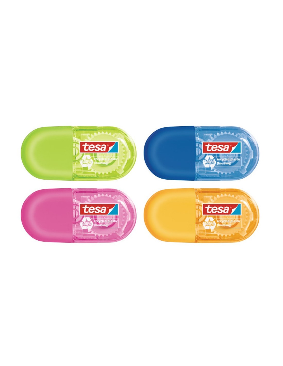 Cinta correctora con carcasa fabricada con plástico 100% reciclado. Diseño ergonómico para un uso más cómodo. Tamaño mini, ideal para llevar a cualquier sitio. Con práctico tapón para proteger al aplicador del deterioro. Colores surtidos. Cinta de soporte muy resistente. Ancho de la cinta: 5 mm. Largo: 6 m.