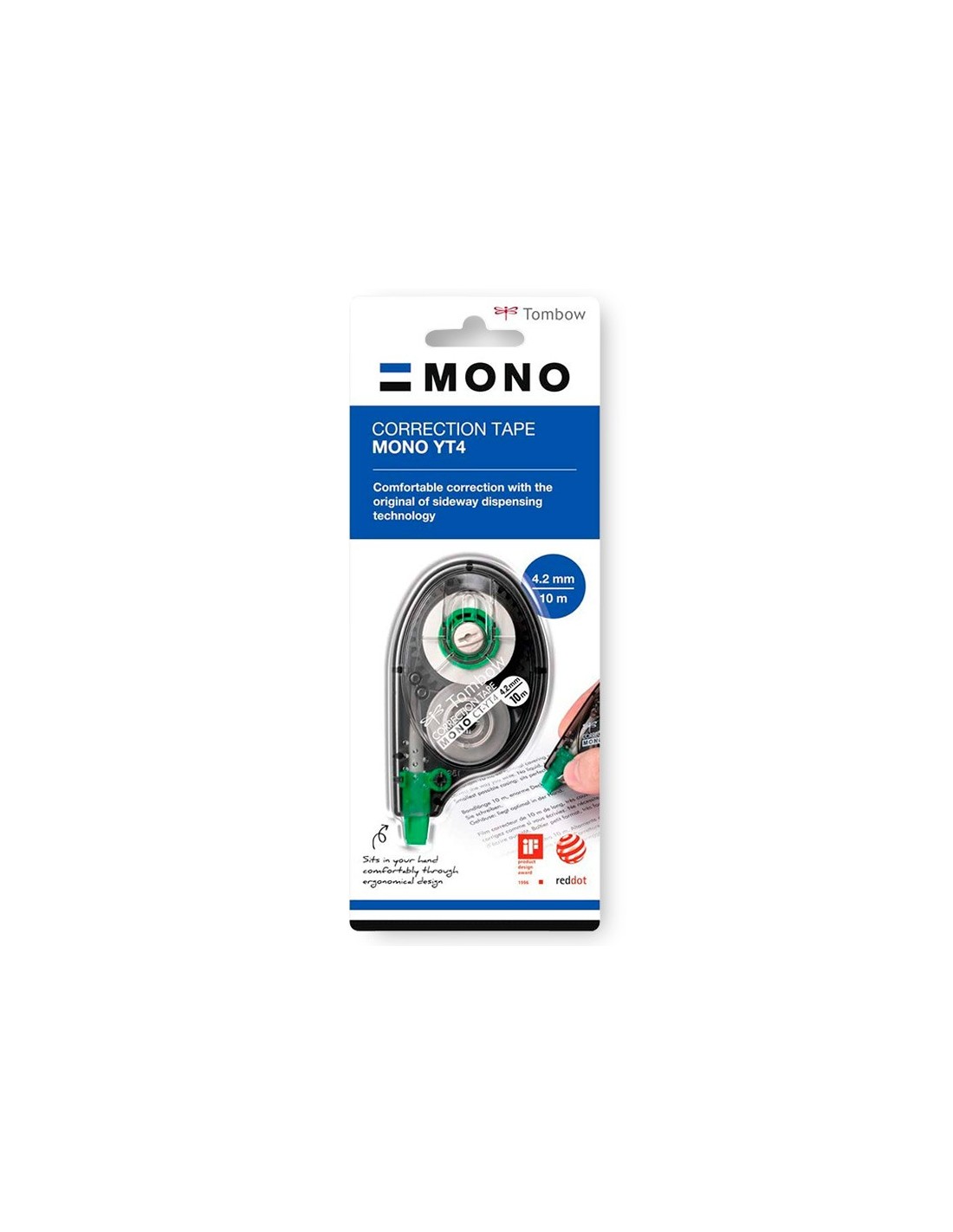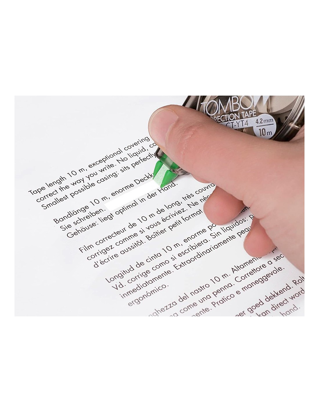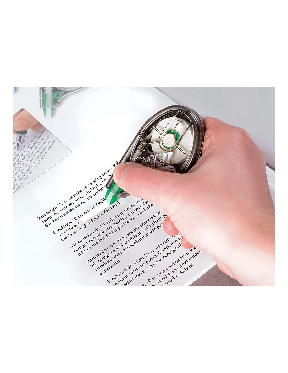 Cinta correctora con diseño ergonómico y tecnología de aplicación lateral para una corrección especialmente cómoda y precisa. Cinta PET resistente al desgarro, aplicable hasta el último milímetro. Sin tiempo de secado, permite escribir encima inmediatamente y con gran pulcritud tras su aplicación. Carcasa hecha con plástico 100% reciclado. Ancho de la cinta: 4,2 mm. Largo: 10 m.