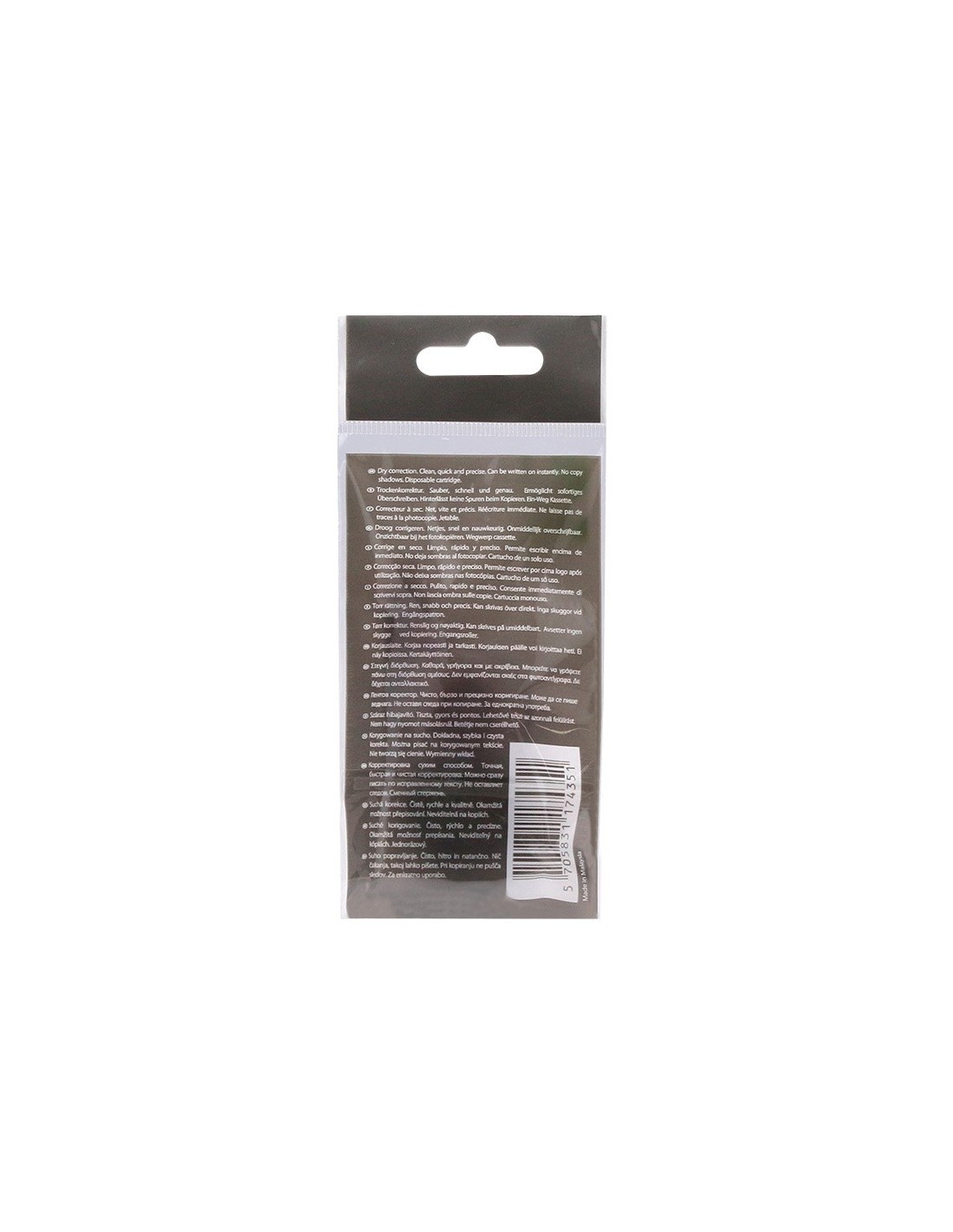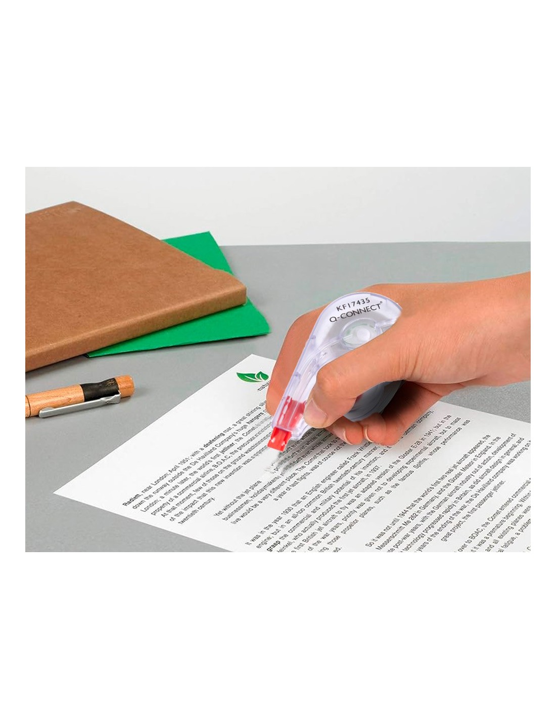 Permite corregir en una sola aplicación. Se puede corregir sobre cualquiertipo de papel, no requiere secado, ni deja sombra en las fotocopias. Perm ite la escritura inmediata con bolígrafo, roller, pluma, etc. Ancho de la cinta: 5 mm. Largo: 12 m. Presentación en bolsa individual de celofán.