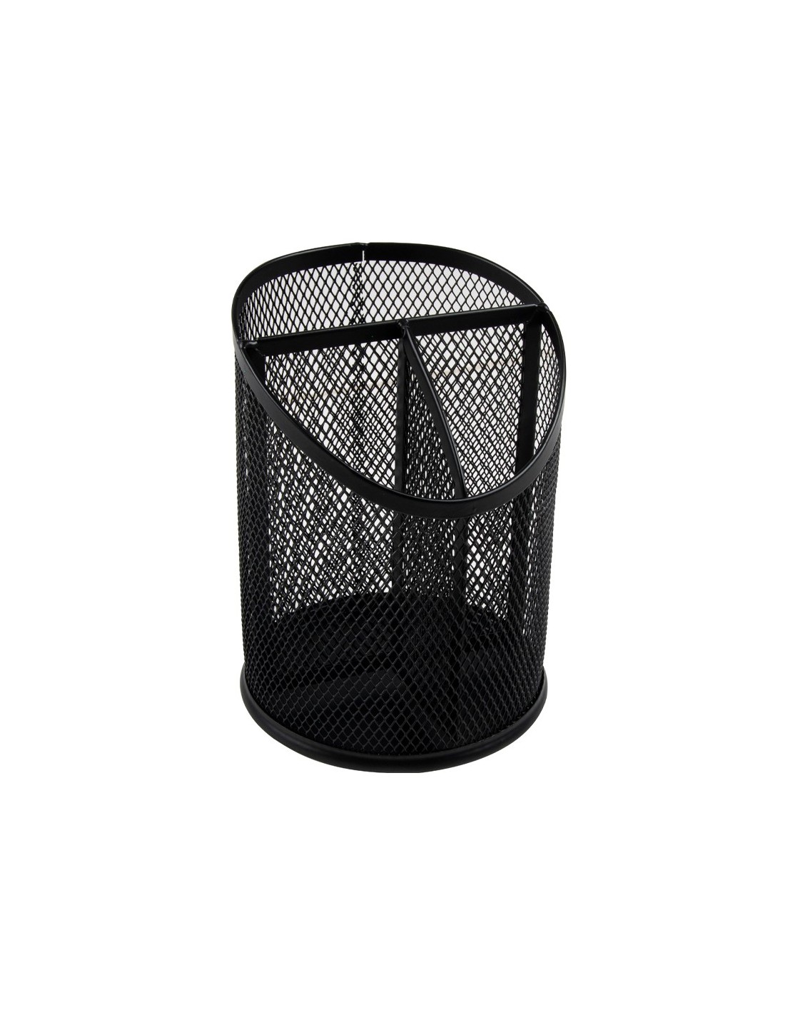 Cubilete redondo de metal de rejilla con 3 compartimentos para clasificar bolígrafos, rotuladores o lápices. Medidas: Ø110 x 147 mm. No incluye accesorios.