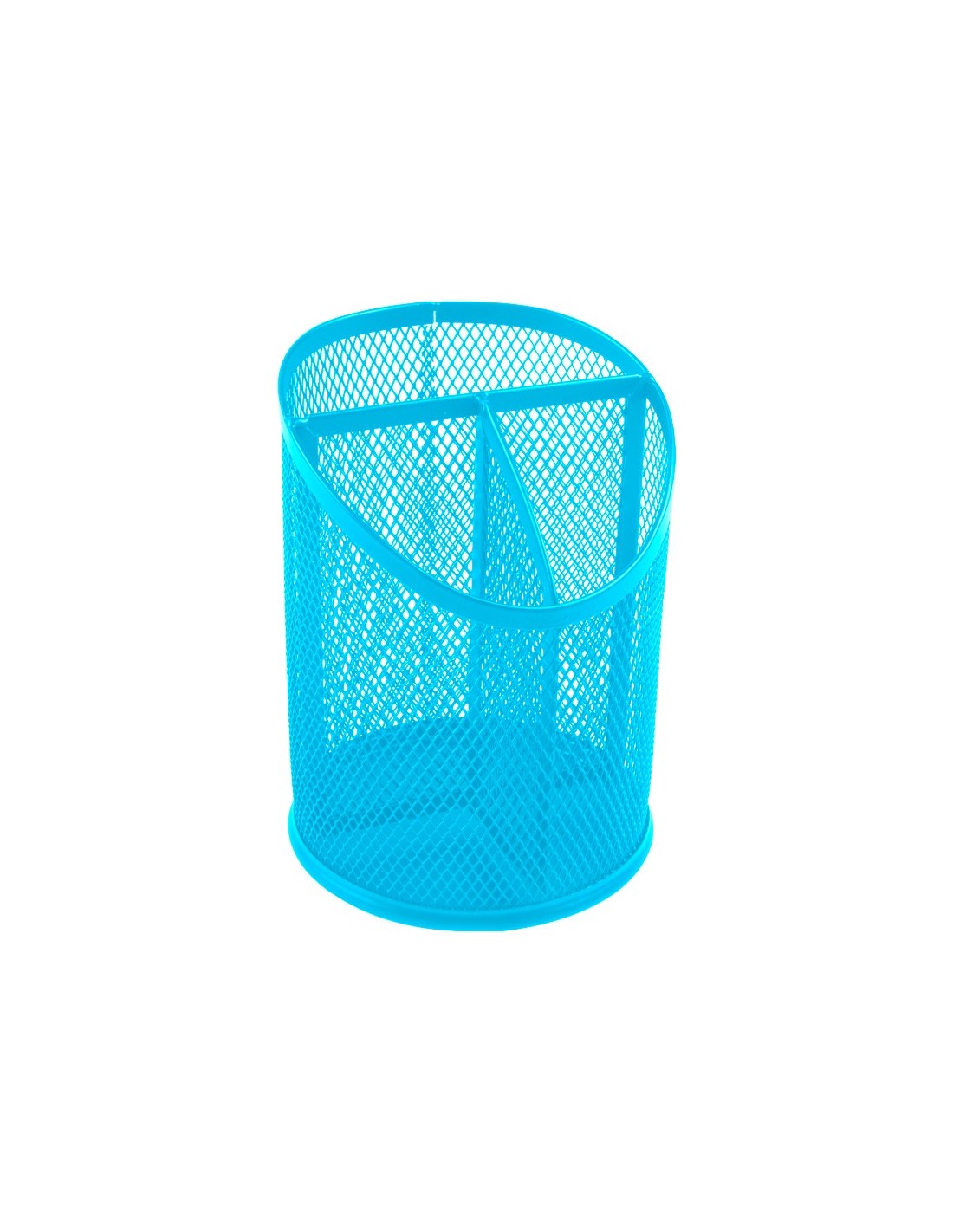 Cubilete redondo de metal de rejilla con 3 compartimentos para clasificar bolígrafos, rotuladores o lápices. Medidas: Ø110 x 147 mm. No incluye accesorios.